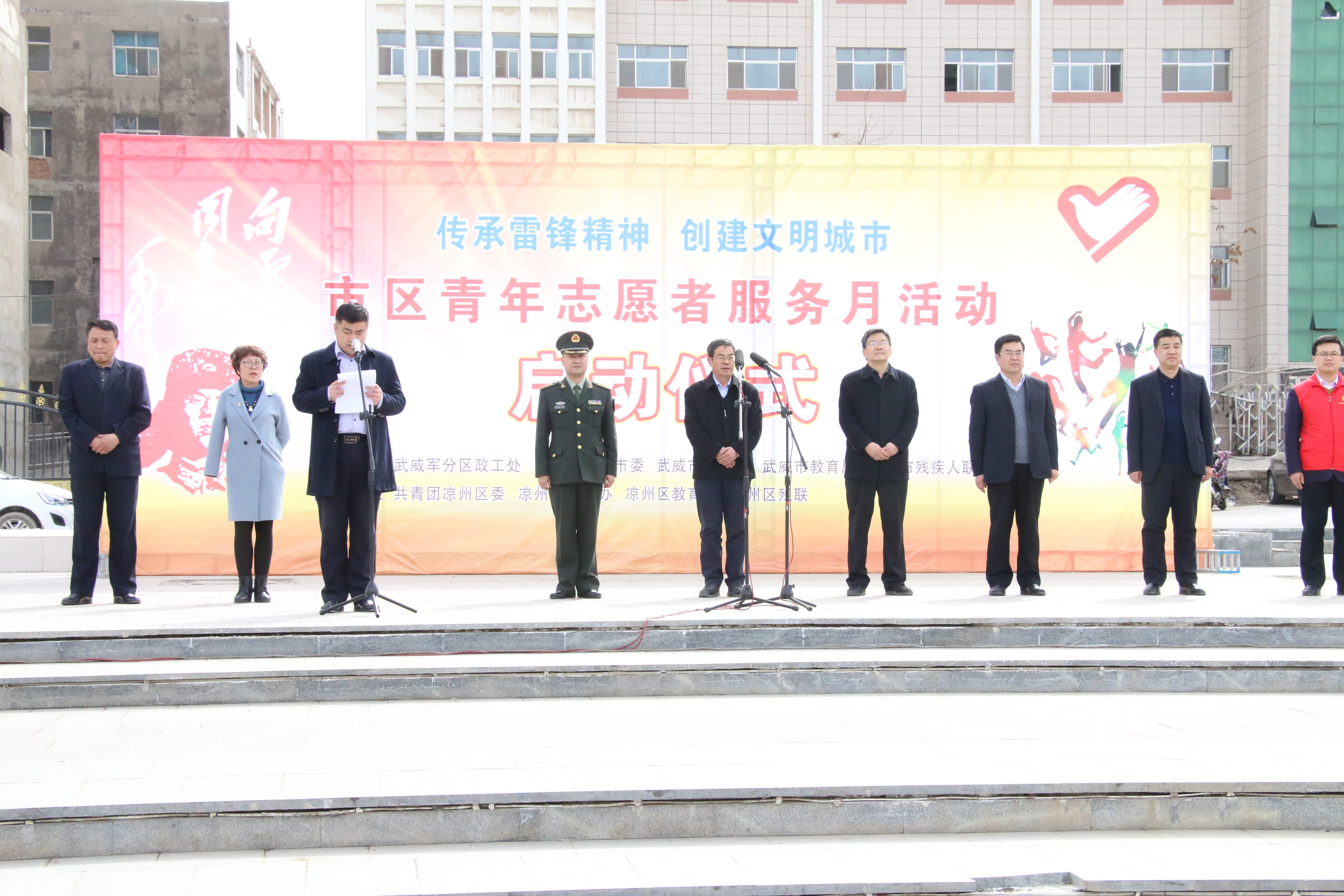 今年是毛澤東等老一輩革命家為雷鋒同志題詞55周年,3月5日是中國青年志愿者服務(wù)日。 3月5日下午,學(xué)院50名志愿者在武威市文化廣場參加了全市志愿者服務(wù)月活動啟動儀式,活動現(xiàn)場氣氛熱烈,市領(lǐng)導(dǎo)為我院志愿服務(wù)隊進(jìn)行了授旗,青年志愿者代表宣讀了倡議書,全體志愿者重溫了青年志愿者誓詞。
