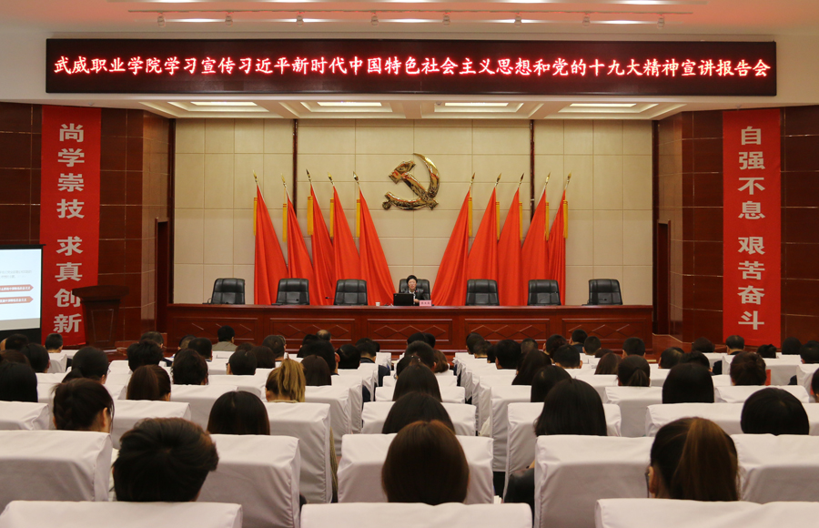 為進(jìn)一步加強(qiáng)對習(xí)近平新時代中國特色社會主義思想和黨的十九大精神的學(xué)習(xí)宣傳教育,4月9日下午,學(xué)院黨委在菁英廳舉行“武威職業(yè)學(xué)院深入學(xué)習(xí)宣傳貫徹習(xí)近平新時代中國特色社會主義思想和黨的十九大精神宣講報(bào)告會”,邀請武威市委講師團(tuán)成員、市委黨校副教授蔡生菊為學(xué)院各院系師生代表、副科級以上領(lǐng)導(dǎo)干部、直屬附屬醫(yī)院領(lǐng)導(dǎo)共計(jì)200余人作宣講報(bào)告。宣講報(bào)告會由宣傳統(tǒng)戰(zhàn)部部長王繼林主持。