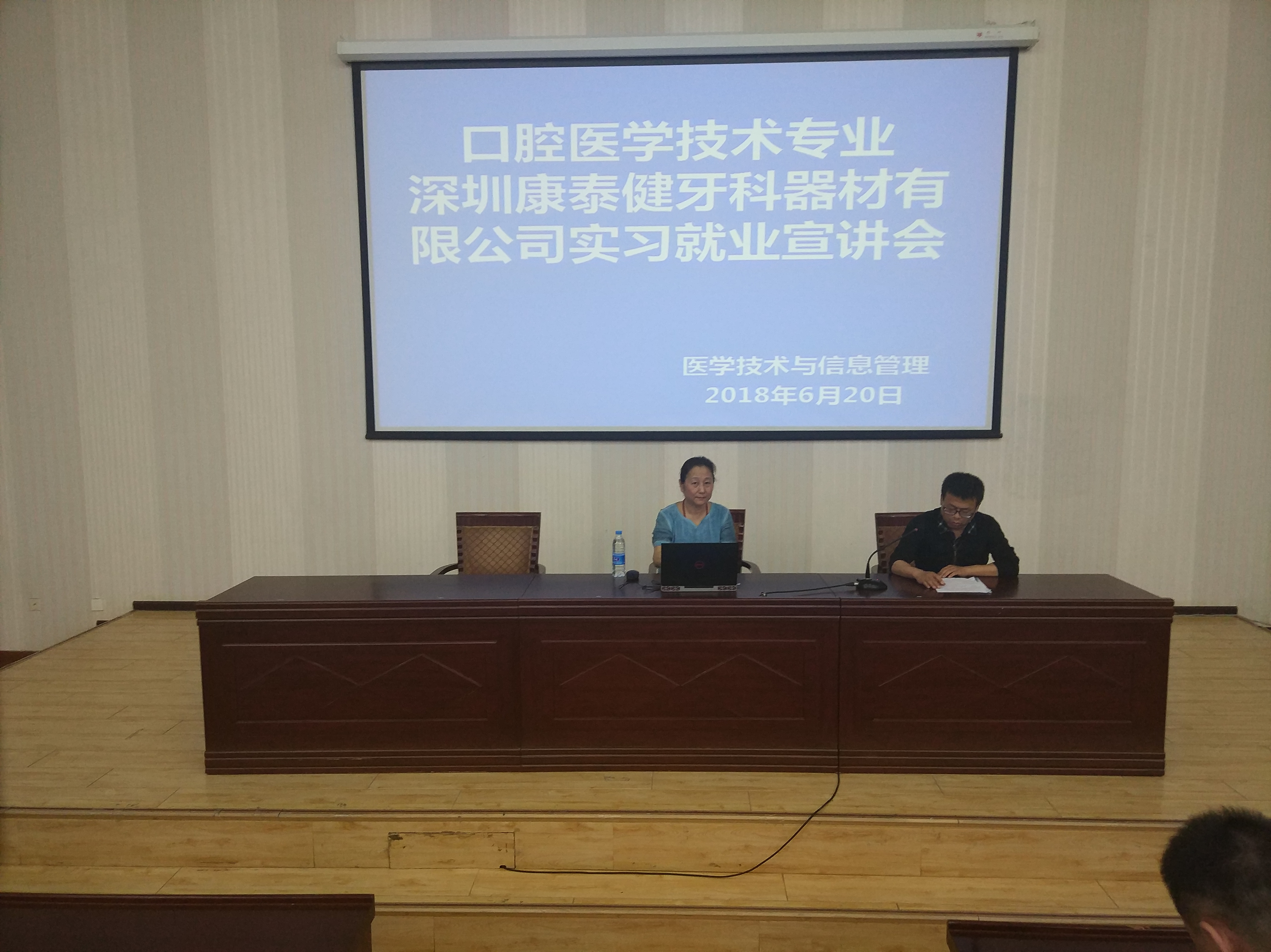 辛金紅校長(zhǎng)對(duì)口腔醫(yī)學(xué)技術(shù)專(zhuān)業(yè)的發(fā)展歷史和當(dāng)前口腔醫(yī)學(xué)技術(shù)的前景做了詳細(xì)介紹;介紹了深圳市康泰健牙科器材有限公司的概況、理念、人才策略,和對(duì)新員工的具體要求和發(fā)展通道;對(duì)同學(xué)最關(guān)心的實(shí)習(xí)期間的待遇進(jìn)行了現(xiàn)場(chǎng)解答。