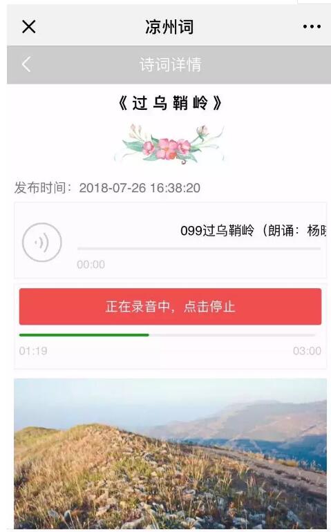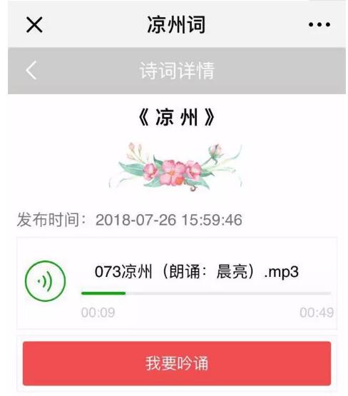 2.單擊自己選定的條目或詩詞名即可進(jìn)入吟誦頁面,點擊”我要吟誦”開始錄入音頻,?吟誦結(jié)束后點擊提交,保存音頻資料即可完成吟誦,已保存的詩詞音頻可在“我的吟誦”列表查看。