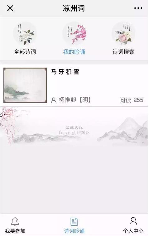 1.打開“武威文化”公眾號,點擊最下方“吟涼州詞”進(jìn)入活動“萬人吟誦涼州詞”活動頁面。