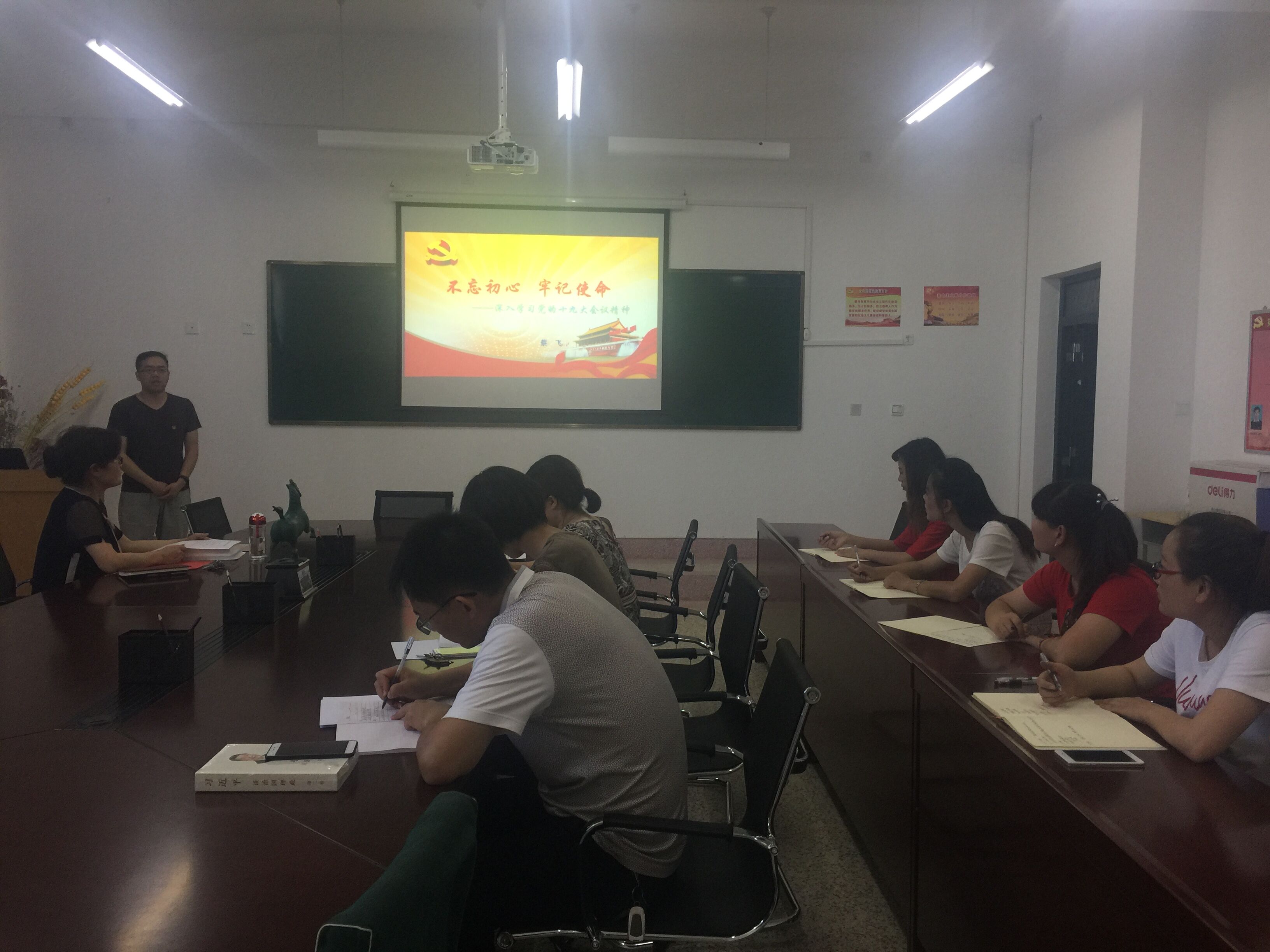 食品專業(yè)黨支部書記蔡飛同志講了題為 “不忘初心 牢記使命——深入學(xué)習(xí)黨的十九大會議精神”的黨課。他主要通過十九大會議的基本情況、重要意義和主題;十九大報告的主要內(nèi)容;十九大報告的重要論斷和亮點,帶領(lǐng)全系黨員再一次深入學(xué)習(xí)了十九大精神。