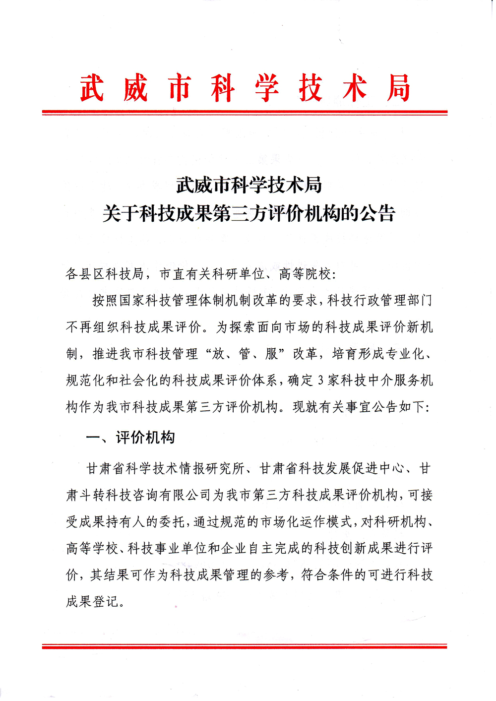 轉(zhuǎn)發(fā)武威市科學(xué)技術(shù)局關(guān)于科技成果第三方評價(jià)機(jī)構(gòu)的公告