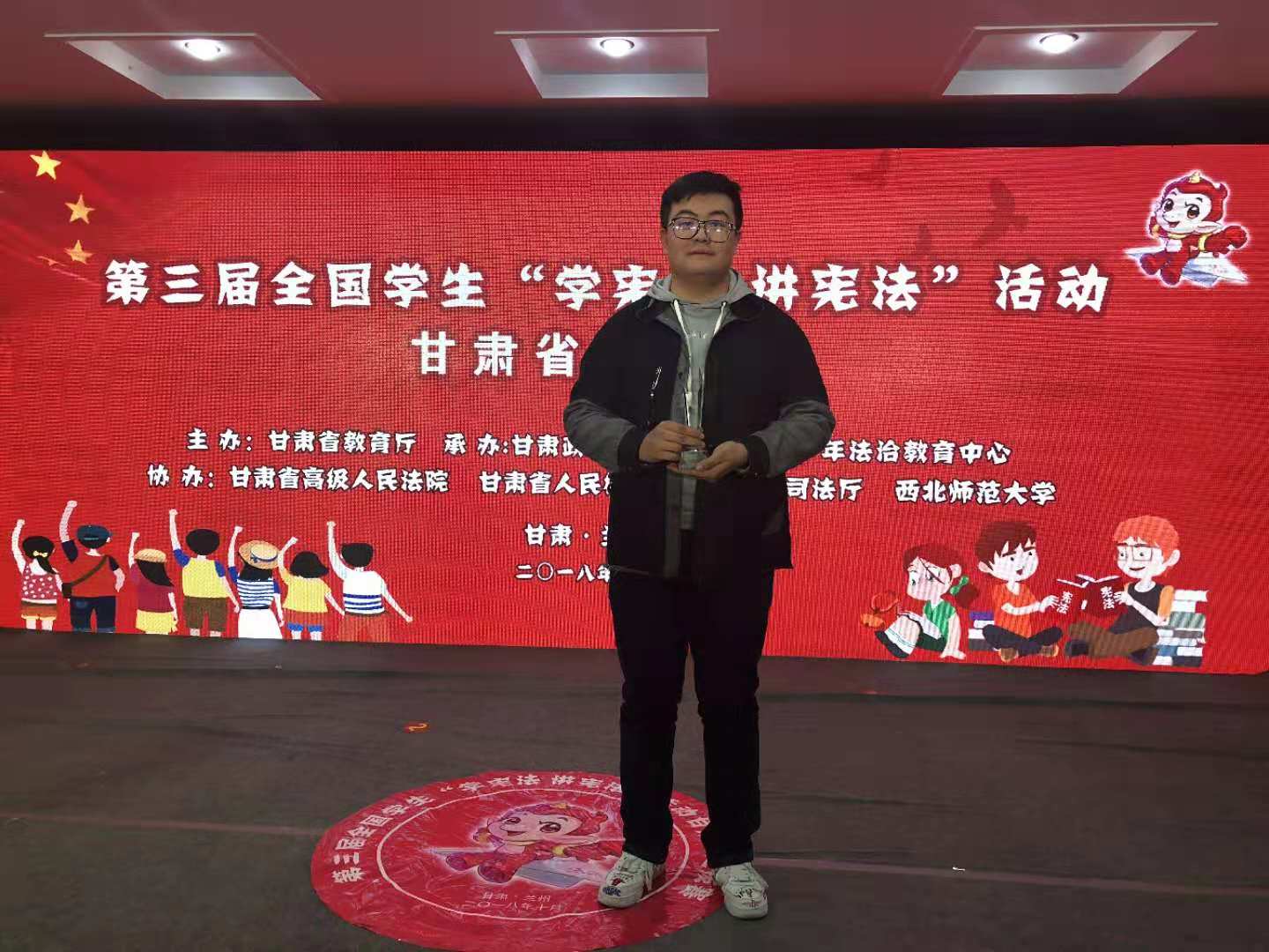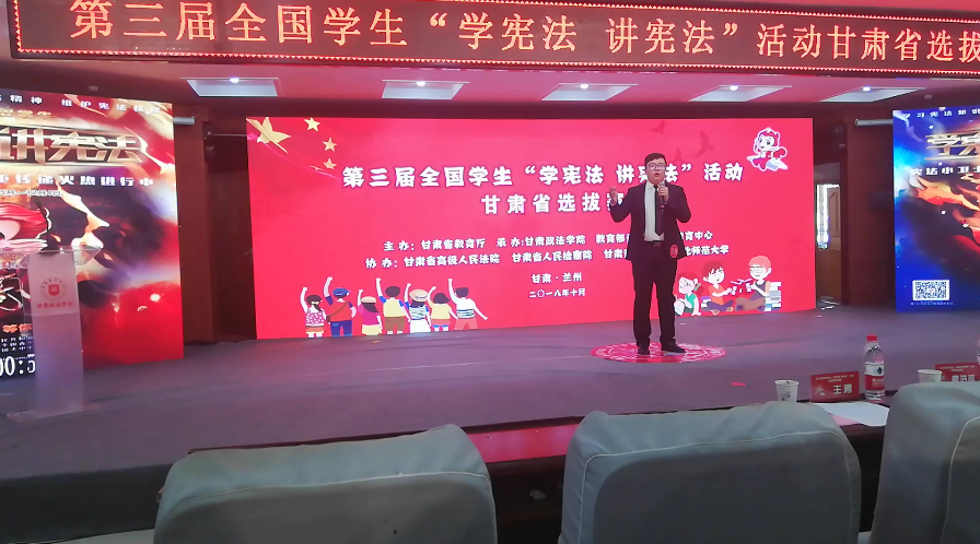 10月15日至19日,由省教育廳主辦的第三屆全國學生“學憲法講憲法”活動甘肅省選拔賽在甘肅政法學院舉行,來自全省的127名選手參加比賽。省教育廳副廳長趙凱出席頒獎儀式并為獲獎集體和個人頒獎。