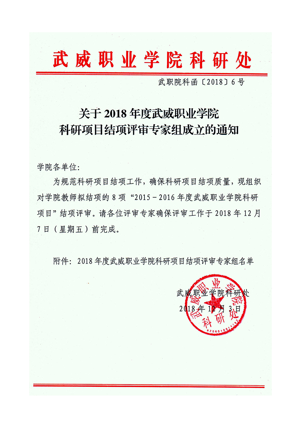 關(guān)于2018年度武威職業(yè)學(xué)院科研項(xiàng)目結(jié)項(xiàng)評(píng)審專家組成立的通知