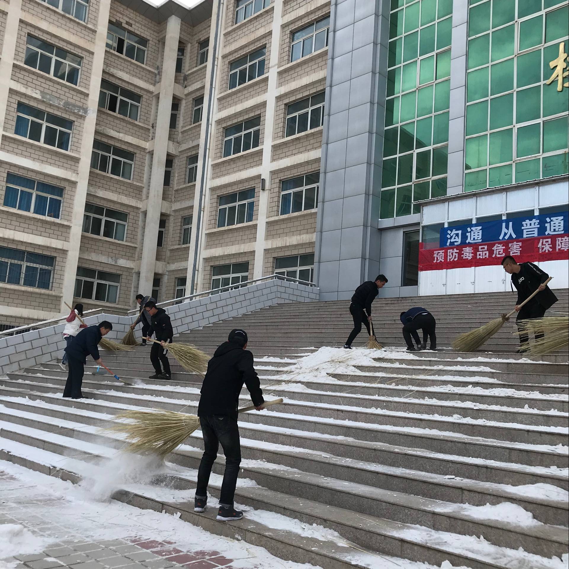 此次活動在博學樓前開展,10多名黨員及入黨積極分子參加此次活動。大家?guī)е鴴咧?、簸箕等清掃工具,在利用課間操的時間將行人走道及樓梯的落雪全部清掃干凈,為校園師生提供了良好的行走安全、衛(wèi)生環(huán)境。