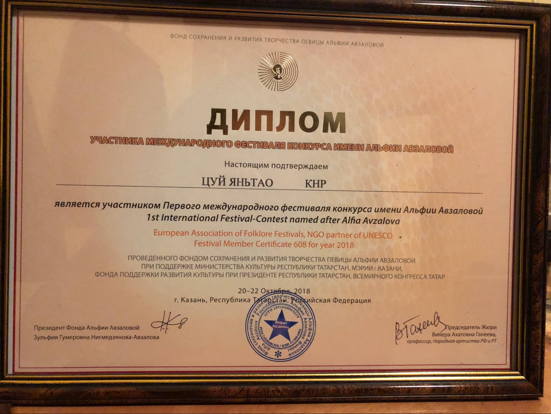 ? ? 1.在以阿菲亞·阿夫扎洛娃命名的第一屆國(guó)際比賽節(jié)(First international contest festiva Named After Alfia avzalova)獲得二等獎(jiǎng),一等獎(jiǎng)空缺。