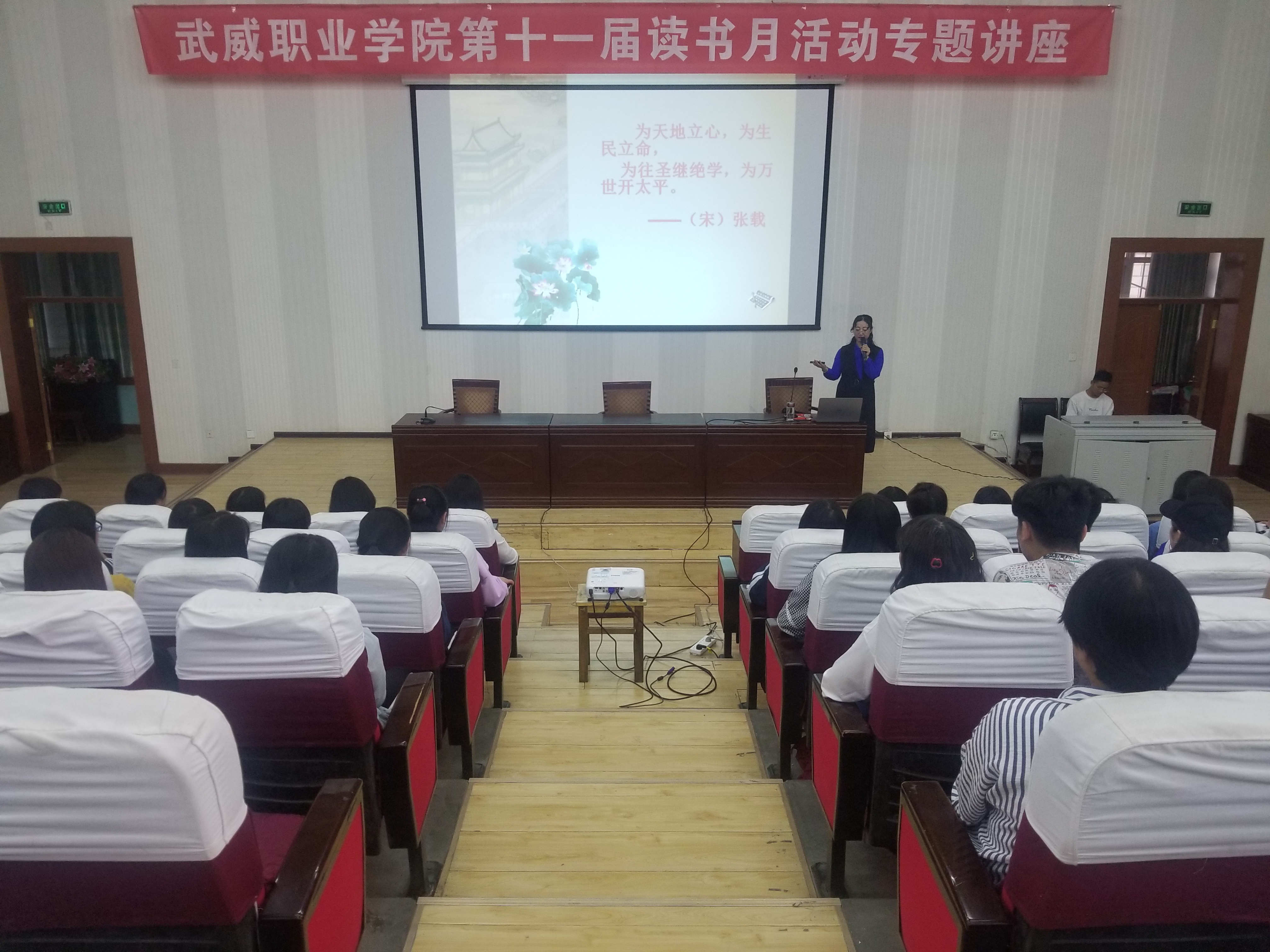 武威職業(yè)學(xué)院第十一屆讀書月活動(dòng)專題講座在正德廳舉行。4月24日學(xué)院中文專業(yè)教授趙穎老師應(yīng)邀進(jìn)行了《走進(jìn)國(guó)學(xué)》的專題講座,近300名師生參加了此次講座。