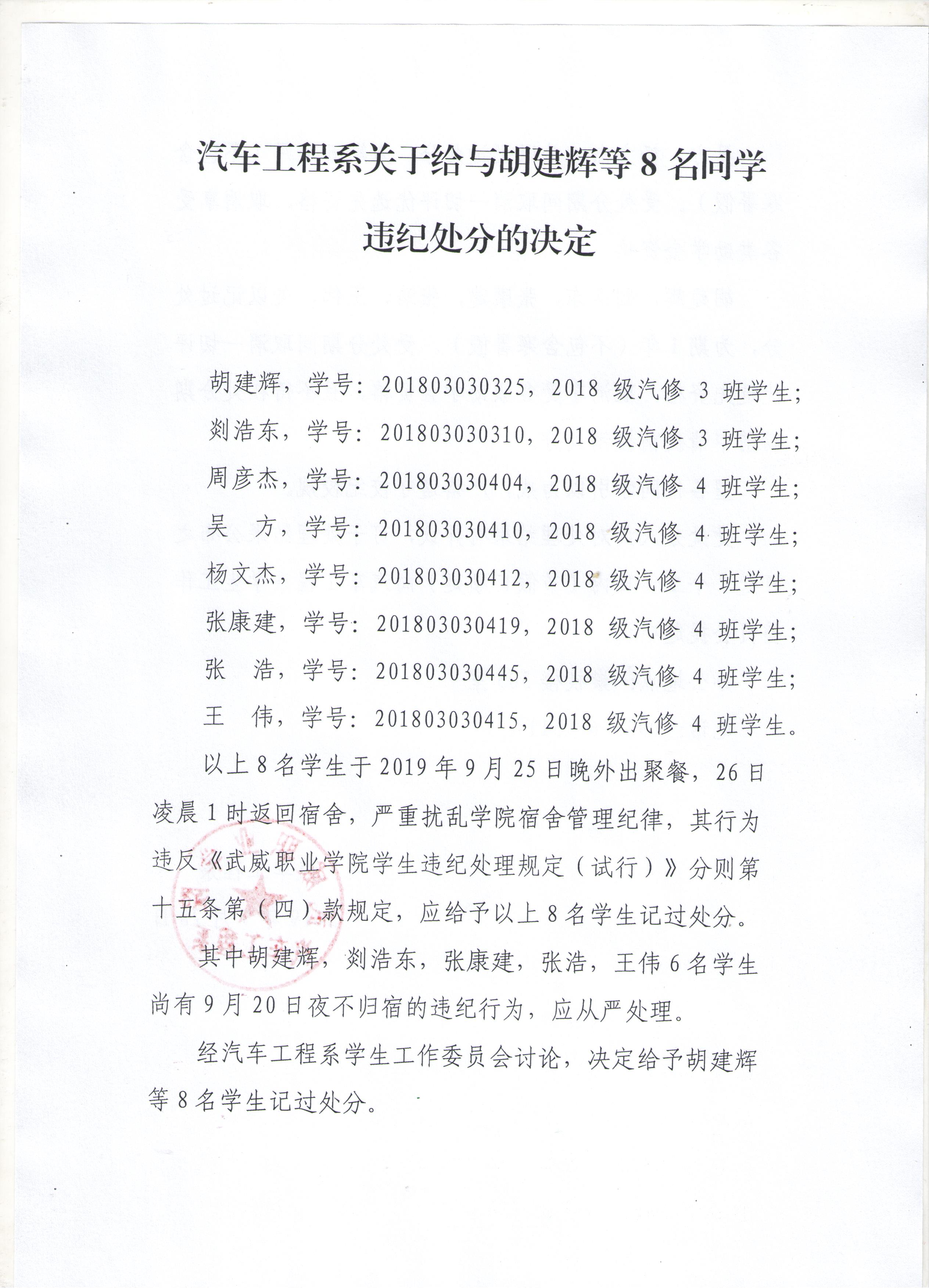 汽車工程系關(guān)于給與胡建輝等8名同學違紀處分的決定