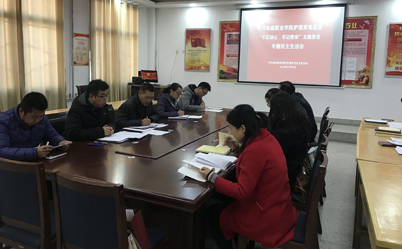 按照學院黨委“不忘初心、牢記使命”主題教育領導小組工作部署,12月9日上午,護理系黨總支在明遠樓103會議室召開“不忘初心、牢記使命”專題民主生活會,會議由系黨總支書記張建輝同志主持。學院黨委委員、副院長王永緒到會指導,護理系全體黨員參加會議。
