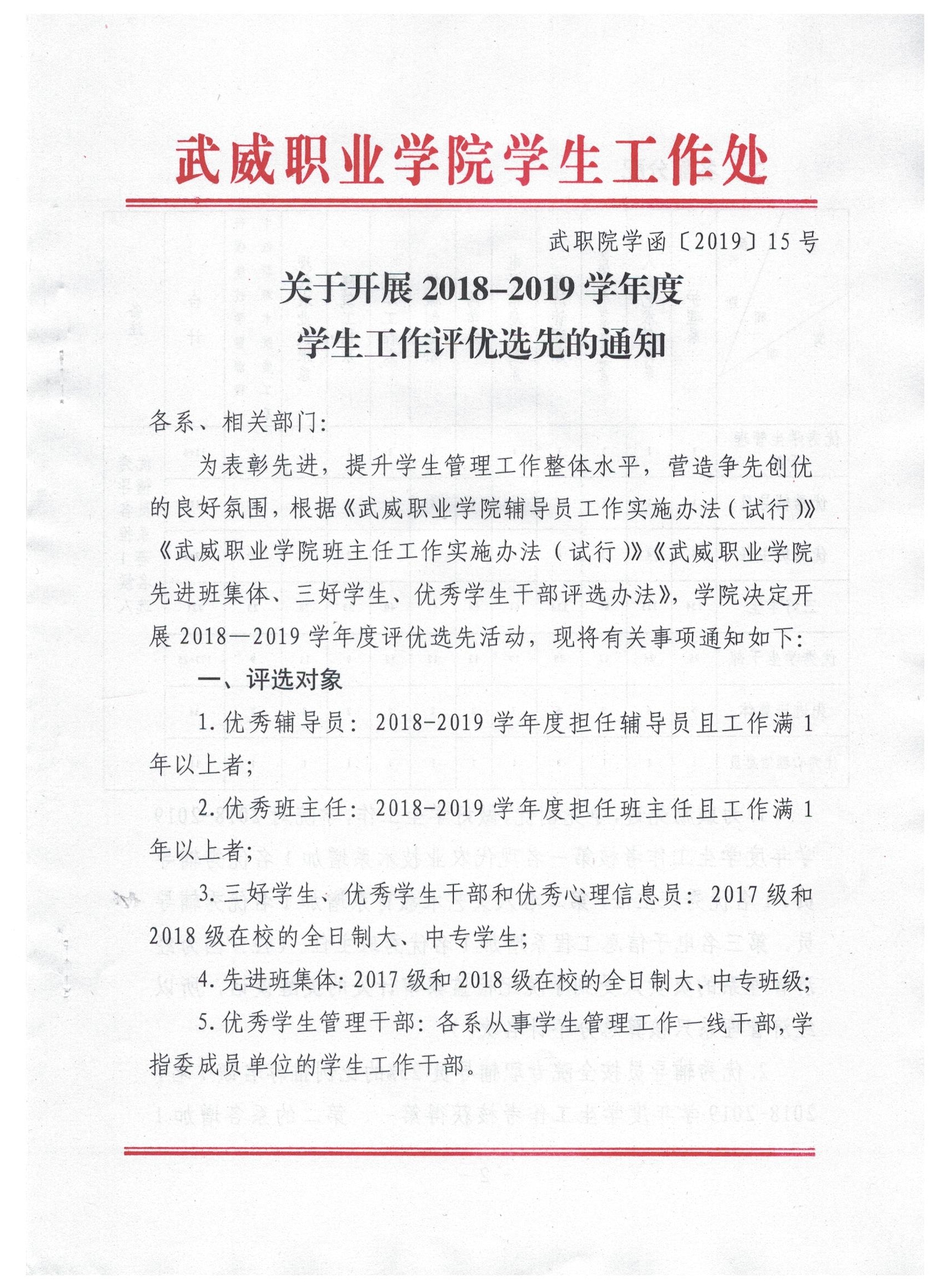 關(guān)于開展2018-2019學(xué)年度學(xué)生工作評(píng)優(yōu)選先的通知