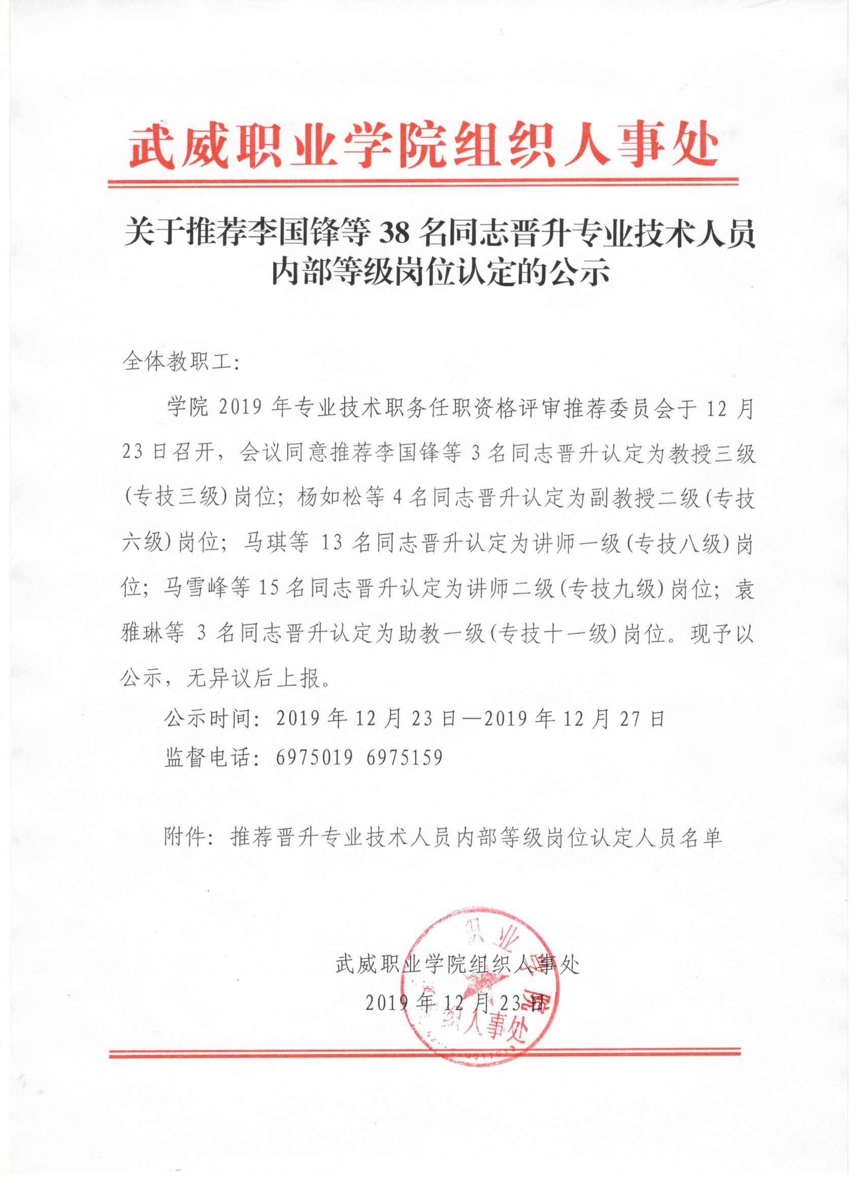 關(guān)于推薦李國(guó)鋒等38名同志晉升專業(yè)技術(shù)人員內(nèi)部等級(jí)崗位認(rèn)定的公示