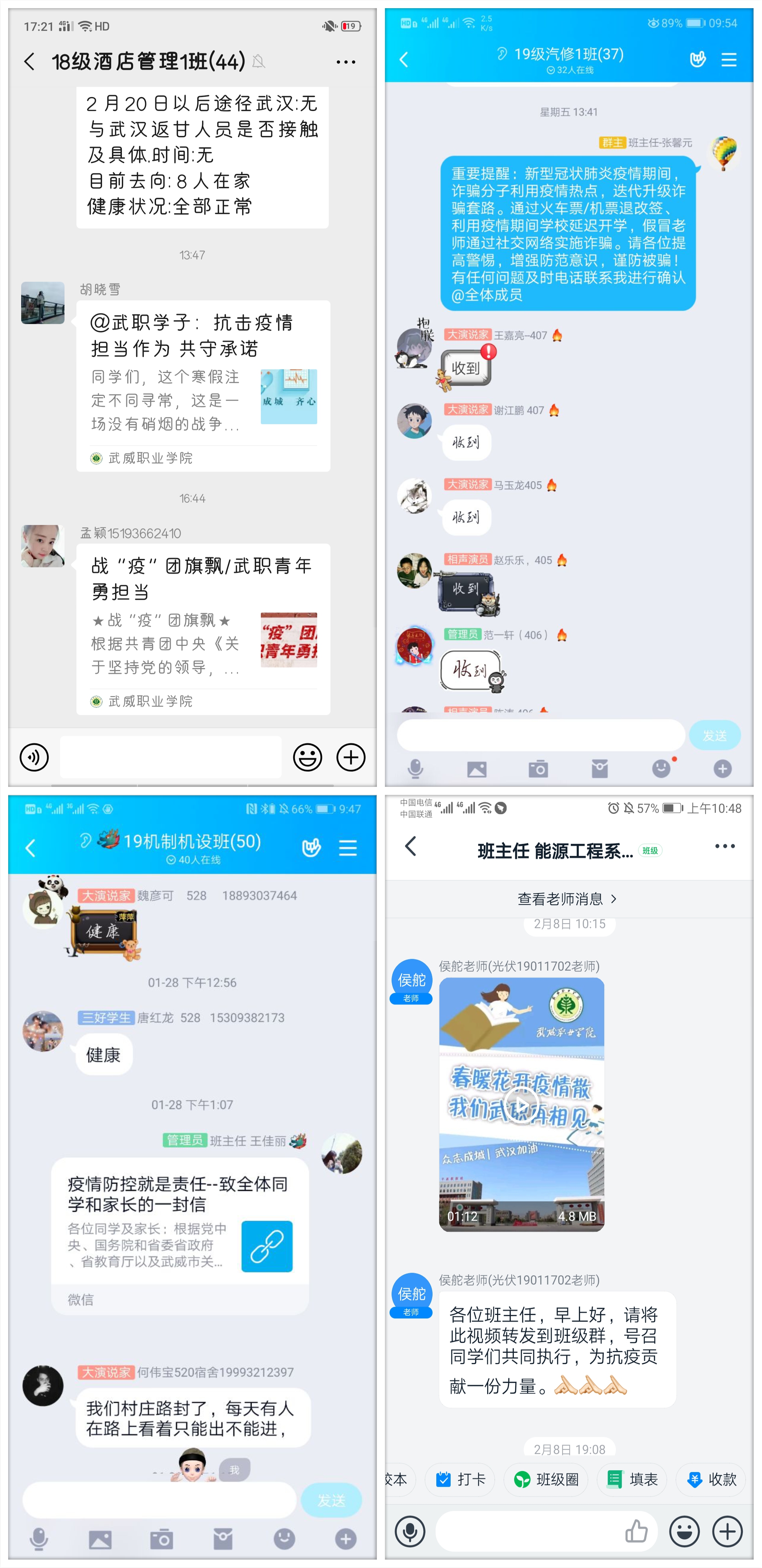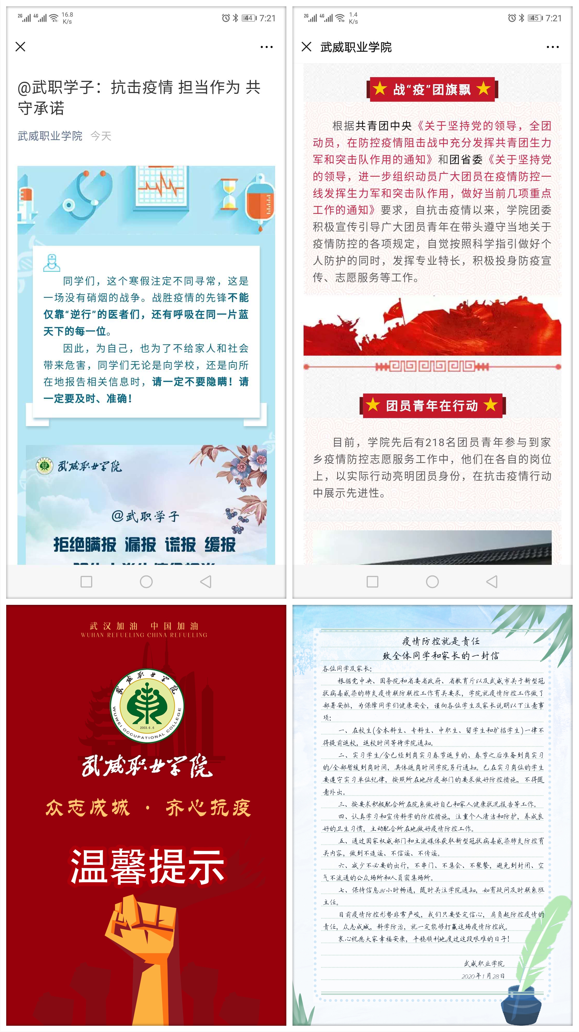 學(xué)生工作處及時發(fā)布了致學(xué)生和家長的一封信《疫情防控就是責(zé)任》,團委制作和推送了《春暖花開疫情散 我們武職再相見》溫馨提示短片和《@武職學(xué)子:抗擊疫情 擔(dān)當(dāng)作為 共守承諾》倡議,用生動形象的表述要求和提醒同學(xué)們不得提前返校,做好個人防護措施,遵守當(dāng)?shù)匾咔榉揽馗黜椧?,做到不信謠不傳謠,及時向?qū)W院報送個人防疫相關(guān)信息,不瞞報不慌報。各院系輔導(dǎo)員和班主任都會第一時間在學(xué)生群里轉(zhuǎn)發(fā),同時把學(xué)院網(wǎng)站和微信平臺上科學(xué)的防控知識和上級的有關(guān)精神及時傳達給學(xué)生,當(dāng)好疫情防控的宣傳員,做到戰(zhàn)疫有“力”。