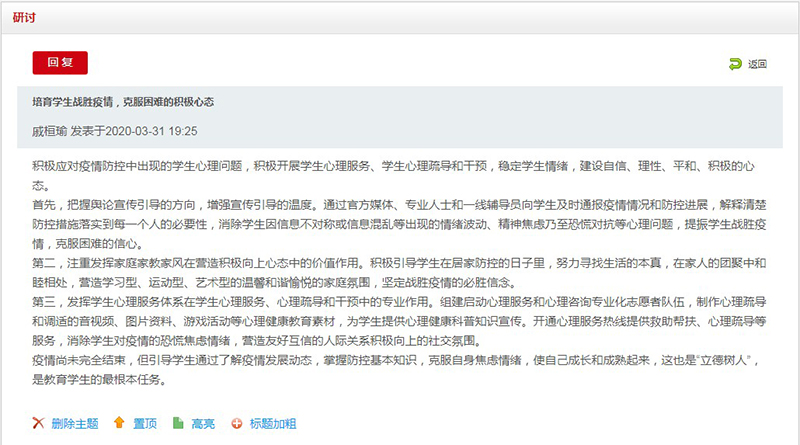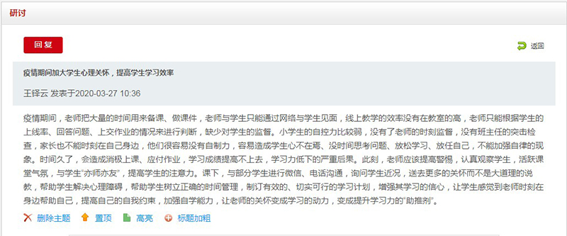 學(xué)生工作處教師姚斌表示,本次培訓(xùn)對(duì)輔導(dǎo)員角色定位及工作職責(zé)有了更深一步的認(rèn)知,對(duì)開展疫情防控工作、提升危機(jī)處理能力、守護(hù)學(xué)生身心健康起到指導(dǎo)作用,能幫助我們及時(shí)掌握特殊時(shí)期學(xué)生思想特點(diǎn)和行為特征,指導(dǎo)今后的工作。