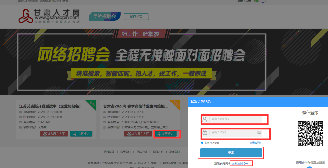 1.手機(jī)瀏覽器搜索甘肅人才網(wǎng)或輸入網(wǎng)址(www.gszhaopin.com),進(jìn)入網(wǎng)站首頁點擊“網(wǎng)絡(luò)招聘會”,——選擇“武威職業(yè)學(xué)院2020屆醫(yī)藥衛(wèi)生類畢業(yè)生網(wǎng)絡(luò)視頻雙選會”點擊“我要報名”按鈕,登錄企業(yè)后臺(無賬號點擊“立即注冊”,資質(zhì)通過審核后再報名),待定審核。