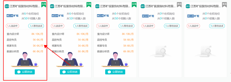 一是主動在“新入場求職者”標(biāo)簽下,瀏覽入場求職人員簡歷,點擊“立即洽談”對意向洽談人員發(fā)出溝通申請,并進(jìn)行面試洽談。如下圖: