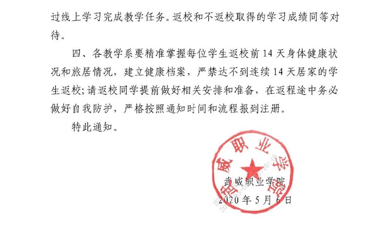 武威職業(yè)學(xué)院關(guān)于2020年春季學(xué)期學(xué)生返校的通知
