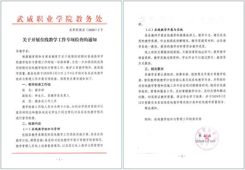各院系及相關(guān)部門要按照教育部和省教育廳關(guān)于疫情防控期間在線教學(xué)工作的文件精神和《武威職業(yè)學(xué)院新型冠狀病毒肺炎疫情防控期間在線教學(xué)工作實(shí)施方案》的相關(guān)要求進(jìn)行全面自查,做到文件精神及要求全部落實(shí)到位、不打折扣;對(duì)執(zhí)行情況進(jìn)行認(rèn)真總結(jié),通過(guò)自查深入挖掘現(xiàn)階段在線教學(xué)實(shí)施和組織管理過(guò)程中的重點(diǎn)問(wèn)題,利用各系教研活動(dòng)和教研團(tuán)隊(duì)推動(dòng)開(kāi)展教學(xué)研究和人才培養(yǎng)模式改革研究,全面落實(shí)問(wèn)題導(dǎo)向,推動(dòng)在線教學(xué)工作落實(shí)落細(xì)落地。