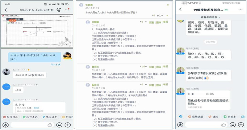 機(jī)械制造系和電信系的教師在課后積極收集學(xué)生的提問(wèn)或者疑難問(wèn)題,利用課余或周末的時(shí)間,在家中通過(guò)白板講解、紙筆講解的方式利用釘釘群直播講解練習(xí)題,開(kāi)展互動(dòng)答疑。