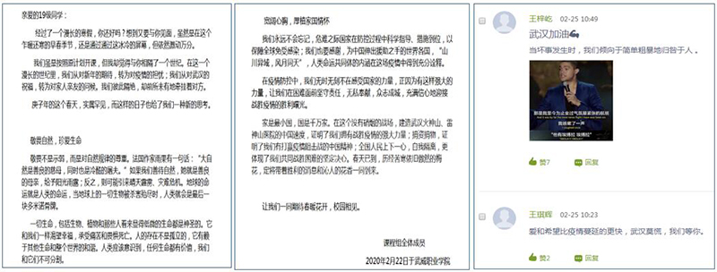 《中華優(yōu)秀傳統(tǒng)文化》課程團(tuán)隊(duì)的馮文娟老師在開學(xué)第一天借助在線教學(xué)平臺(tái)向?qū)W生推送了《致2019級(jí)學(xué)生的一封信》,激勵(lì)學(xué)生要敬畏自然、珍愛生命,致敬英雄、感恩榜樣,寬闊心胸、厚植家國(guó)情懷。信中這樣寫道:“在疫情防控中,我們無(wú)時(shí)無(wú)刻不在感受國(guó)家的力量,正因?yàn)橛羞@樣強(qiáng)大的力量,讓我們?cè)诶щy面前堅(jiān)守責(zé)任,無(wú)私奉獻(xiàn),眾志成城,充滿信心地迎接戰(zhàn)勝疫情的勝利曙光。”“ 家是最小國(guó),國(guó)是千萬(wàn)家。在這個(gè)沒有硝煙的戰(zhàn)場(chǎng),建造武漢火神山、雷神山醫(yī)院的中國(guó)速度,證明了我們擁有戰(zhàn)勝疫情的強(qiáng)大力量;捐資捐物,證明了我們有打贏疫情阻擊戰(zhàn)的中國(guó)精神;全國(guó)人民上下一心,自我隔離,更體現(xiàn)了我們共同戰(zhàn)勝困難的堅(jiān)定決心。春天已到,歷經(jīng)苦寒依舊傲然的梅花,定將帶著勝利的消息和沁人的花香一同到來(lái)?!蓖瑫r(shí),為學(xué)生推送由央視頻和有道精品課共同錄制的《面對(duì)疫情教你如何有效防范》疫情防控專題視頻,與學(xué)生一起為打贏新冠肺炎疫情防控阻擊戰(zhàn)貢獻(xiàn)力量。
