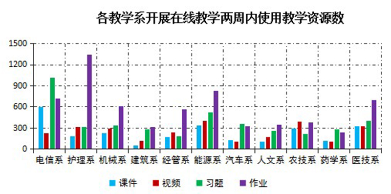 開展在線教學(xué)兩周以來(lái),通過學(xué)院在線教學(xué)平臺(tái)管理后臺(tái)數(shù)據(jù)整理分析,教師為在線授課準(zhǔn)備了充足的教學(xué)資源。兩周內(nèi),學(xué)院教學(xué)平臺(tái)新上傳教學(xué)課件2527個(gè),教學(xué)視頻2701個(gè);新設(shè)置課堂練習(xí)題4176道,發(fā)布課后作業(yè)題6375道,豐富的資源有力支持在線教學(xué)順利進(jìn)行。