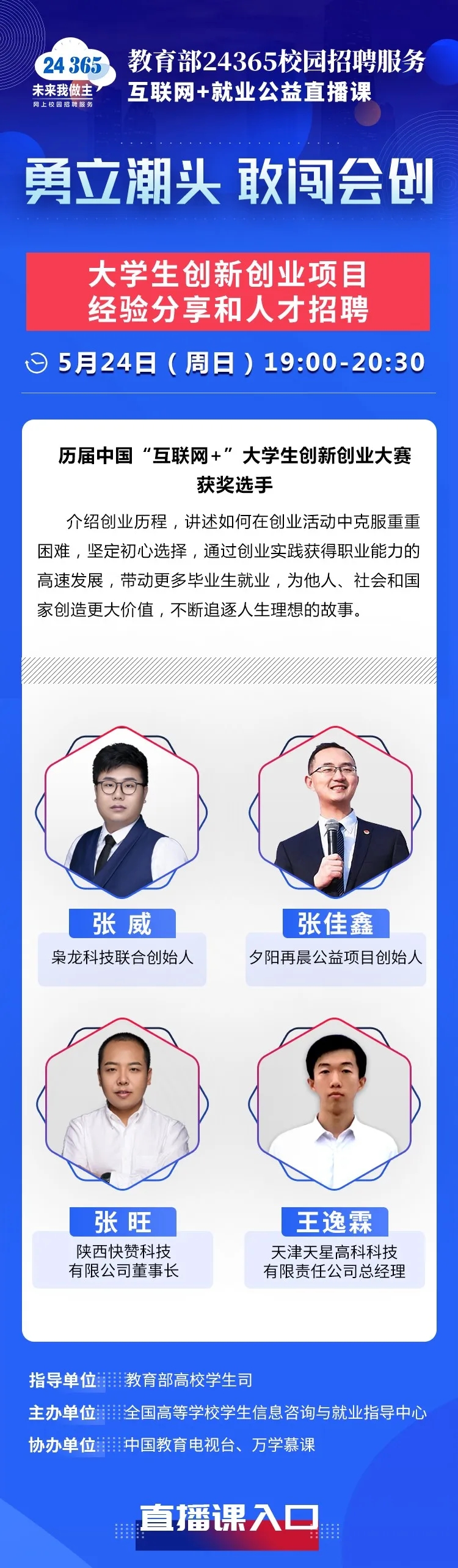 教育部24365就業(yè)公益課程:勇立潮頭 敢闖會創(chuàng)——大學(xué)生創(chuàng)新創(chuàng)業(yè)項(xiàng)目經(jīng)驗(yàn)分享和人才招聘