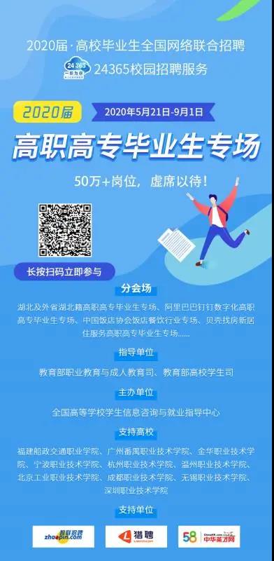 為了進(jìn)一步促進(jìn)2020屆高職高專畢業(yè)生就業(yè),教育部高校學(xué)生司和職業(yè)教育與成人教育司聯(lián)合推出“高職高專畢業(yè)生專場(chǎng)招聘會(huì)”,首批推出崗位超過50萬(wàn)個(gè)。畢業(yè)生可登錄教育部大學(xué)生就業(yè)網(wǎng)(新職業(yè)網(wǎng)www.ncss.cn)或直接掃描宣傳頁(yè)中的二維碼參與活動(dòng)。