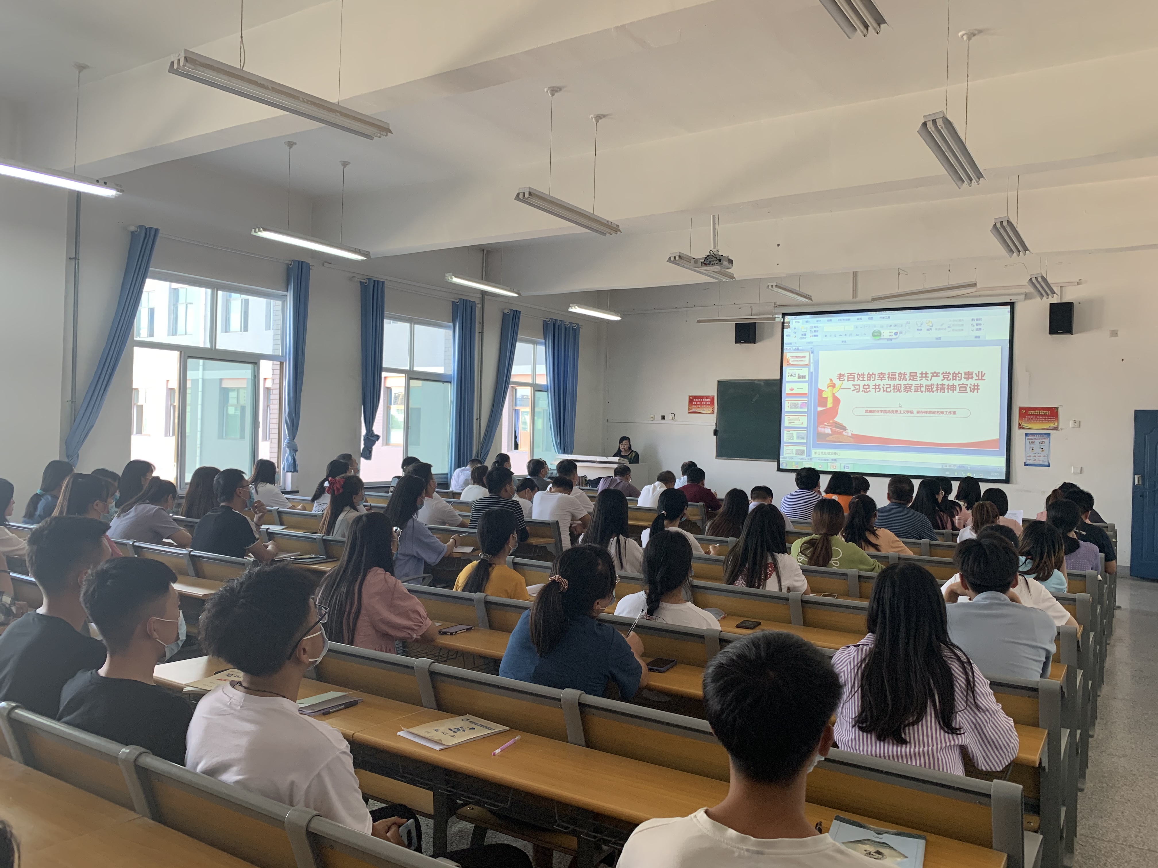 王靜老師圍繞習近平總書記視察甘肅,特別是2019年8月21日視察古浪縣黃花灘移民區(qū)富民新村社區(qū)和八步沙林場時的重要講話和指示精神,向廣大師生展開深入宣講,闡釋解讀習近平總書指出的“老百姓的幸福就是共產黨的事業(yè)”的本質內涵,使習近平總書記對武威人民的情感關懷深入人心。