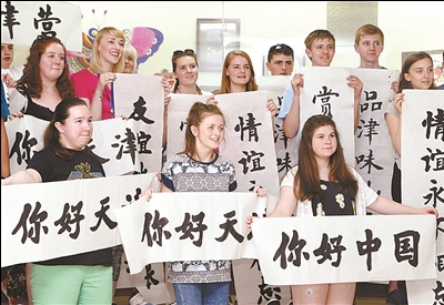 ④ 6月10日,在天津國(guó)際漢語學(xué)院,參與“妙筆練書法”活動(dòng)的蘇格蘭師生展示自己的作品。
