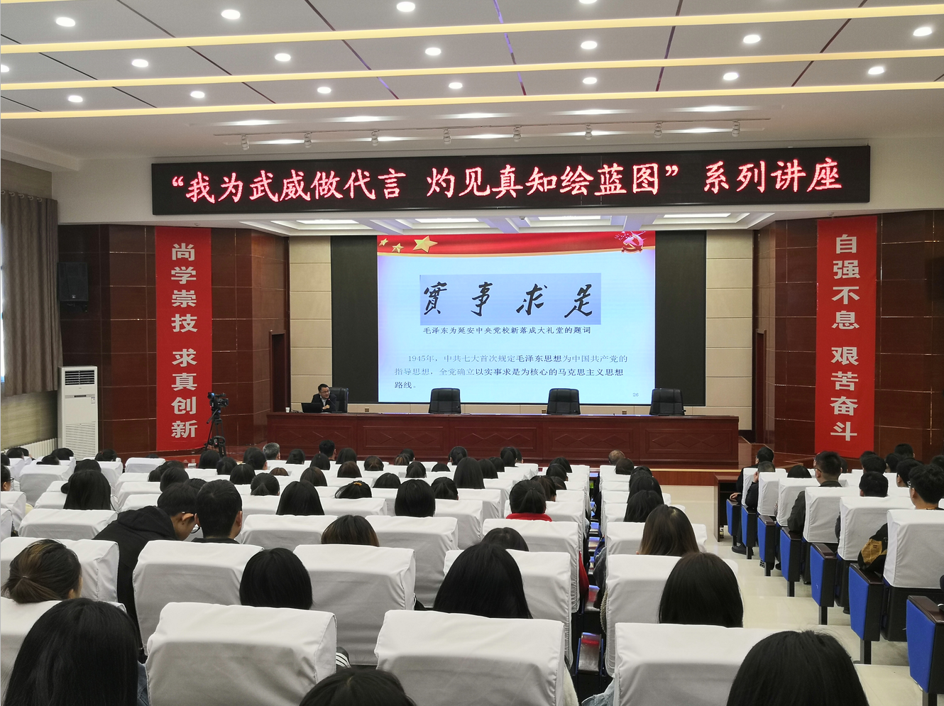 3月16日,武威職業(yè)學(xué)院“綠洲講壇”第12期在學(xué)院菁英廳舉行,本期活動(dòng)邀請(qǐng)到中國社科院哲學(xué)研究所副研究員、民勤縣委副書記周丹作主題為《掌握看家本領(lǐng) 堅(jiān)定理想信念》的報(bào)告。學(xué)院領(lǐng)導(dǎo)班子、中層干部、師生代表220余人參加了報(bào)告會(huì)。