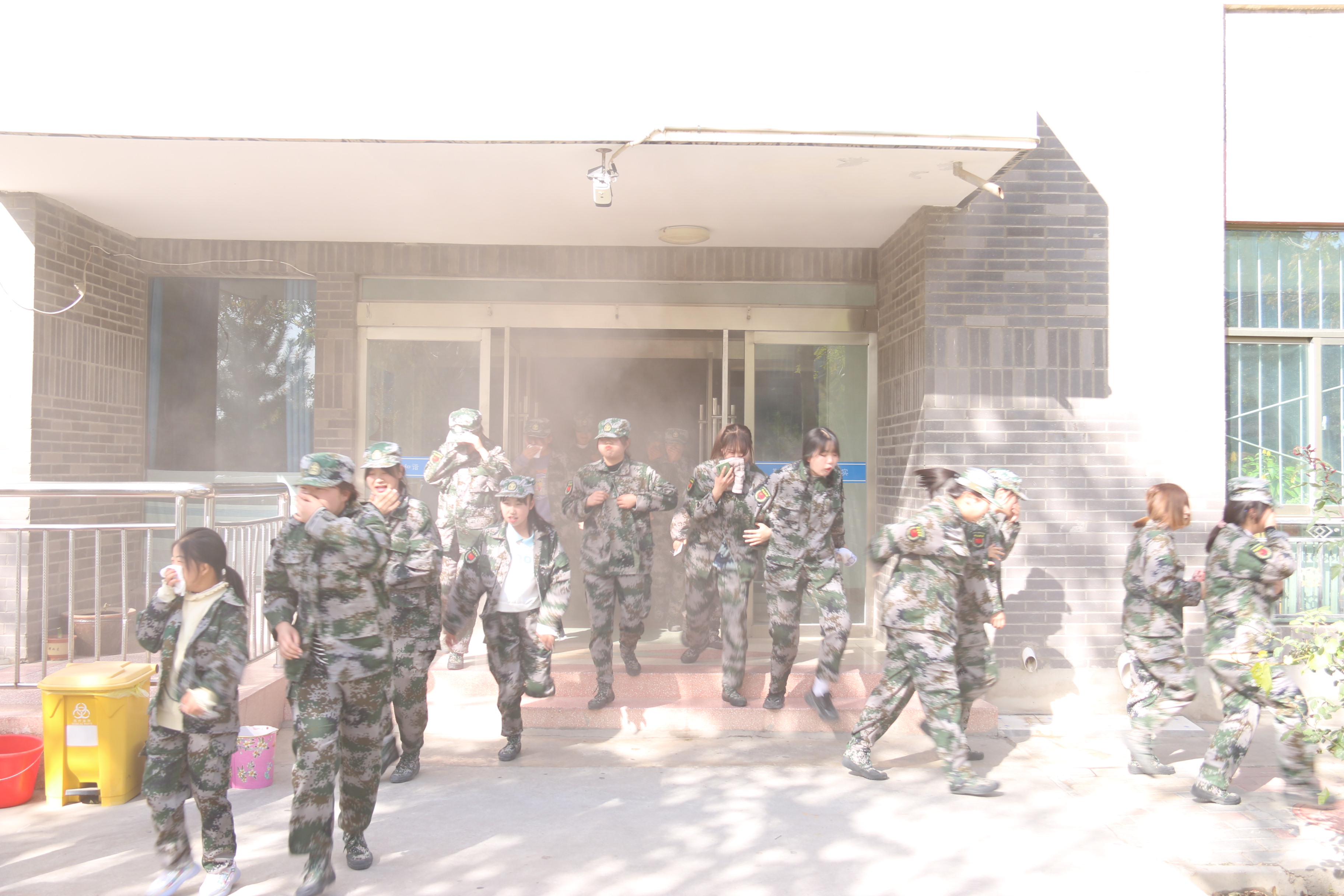 14時40分,疏散演練正式開始。隨著火災警報響起,學生公寓樓冒出滾滾濃煙,公寓管理人員迅速組織學生有序疏散。在管理人員的引導下,同學們按照動作要領,用濕毛巾捂住口鼻,俯身彎腰按照安全出口指示牌快速、有序從疏散通道撤離到安全地帶,整個過程緊張有序、實用性強,收到了預期效果。