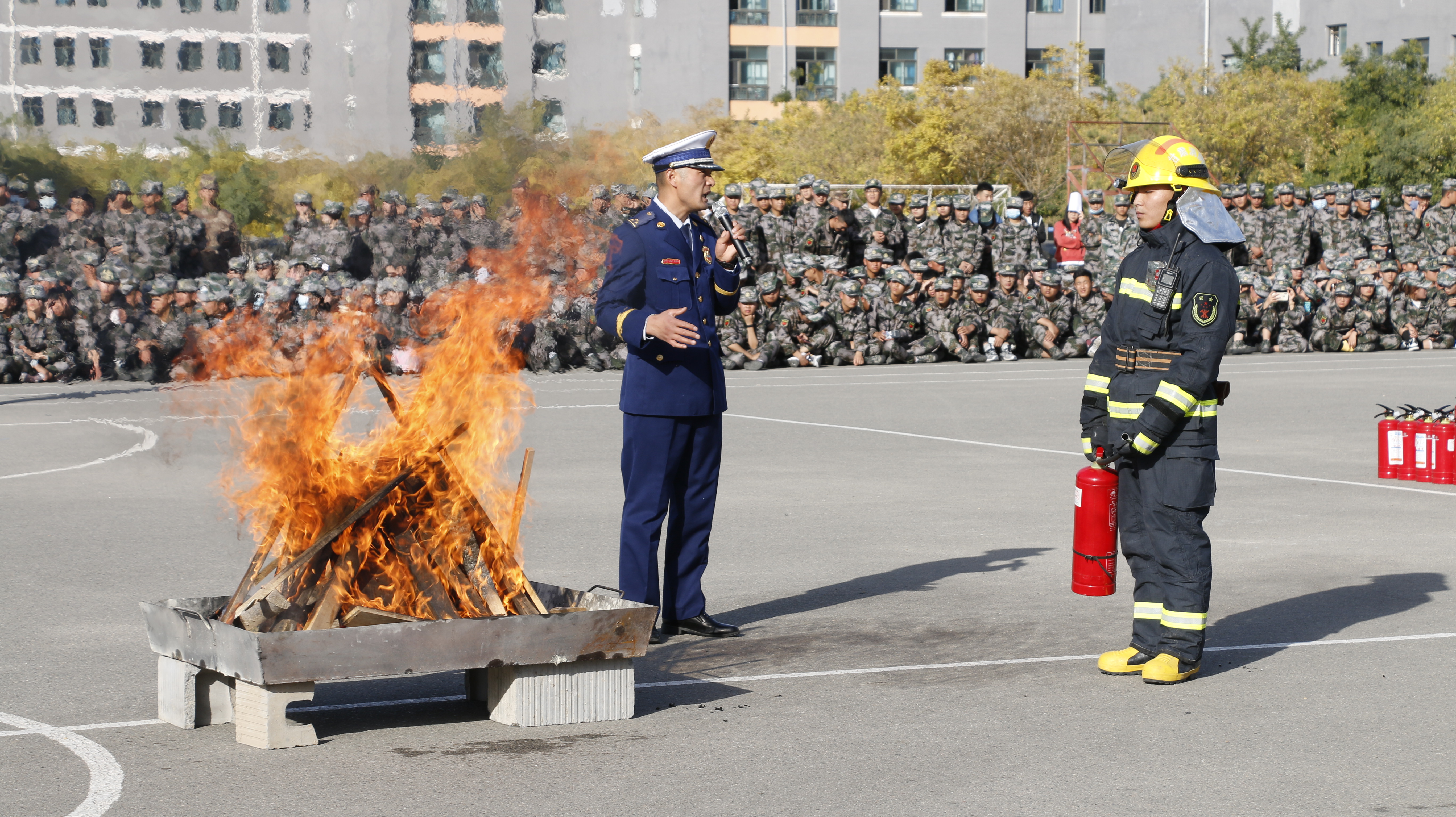 隨后,2020級全體新生整隊到操場參加了滅火演練。在消防救援中隊指戰(zhàn)員的講解和示范下,同學們學習了應急逃生、火災報警和滅火器使用等消防安全常識,學生代表體驗了處置液化氣瓶滅火、油鍋滅火、干粉滅火器滅火等操作,在實戰(zhàn)中提高了消防應急能力。