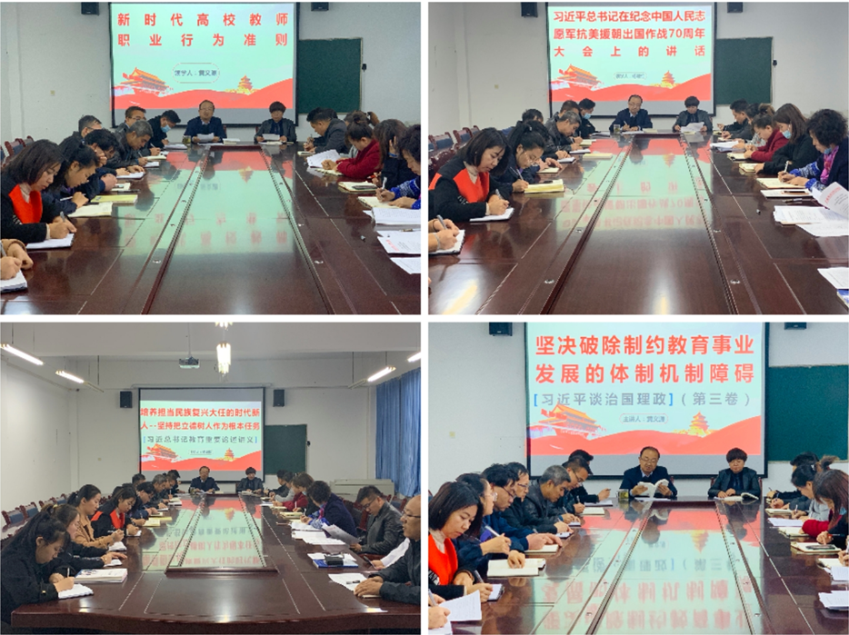 黃文源領(lǐng)學(xué)了《習(xí)近平談治國理政》(第三卷)第十二條 提高保障和改善民生水平——堅決破除制約教育事業(yè)發(fā)展的體質(zhì)機制障礙,解讀了《新時代高校教師職業(yè)行為十項準(zhǔn)則》,要求所有教師要做以德立身、以德立學(xué)、以德施教、以德育德的楷模。楊如松領(lǐng)學(xué)了《習(xí)近平總書記教育重要論述講義》第二講 培養(yǎng)擔(dān)當(dāng)民族復(fù)興大任的時代新人——堅持把立德樹人作為根本任務(wù)。楊建紅老師領(lǐng)學(xué)了習(xí)近平總書記在紀(jì)念中國 人民志愿軍抗美援朝出國作戰(zhàn)70周年大會的講話。