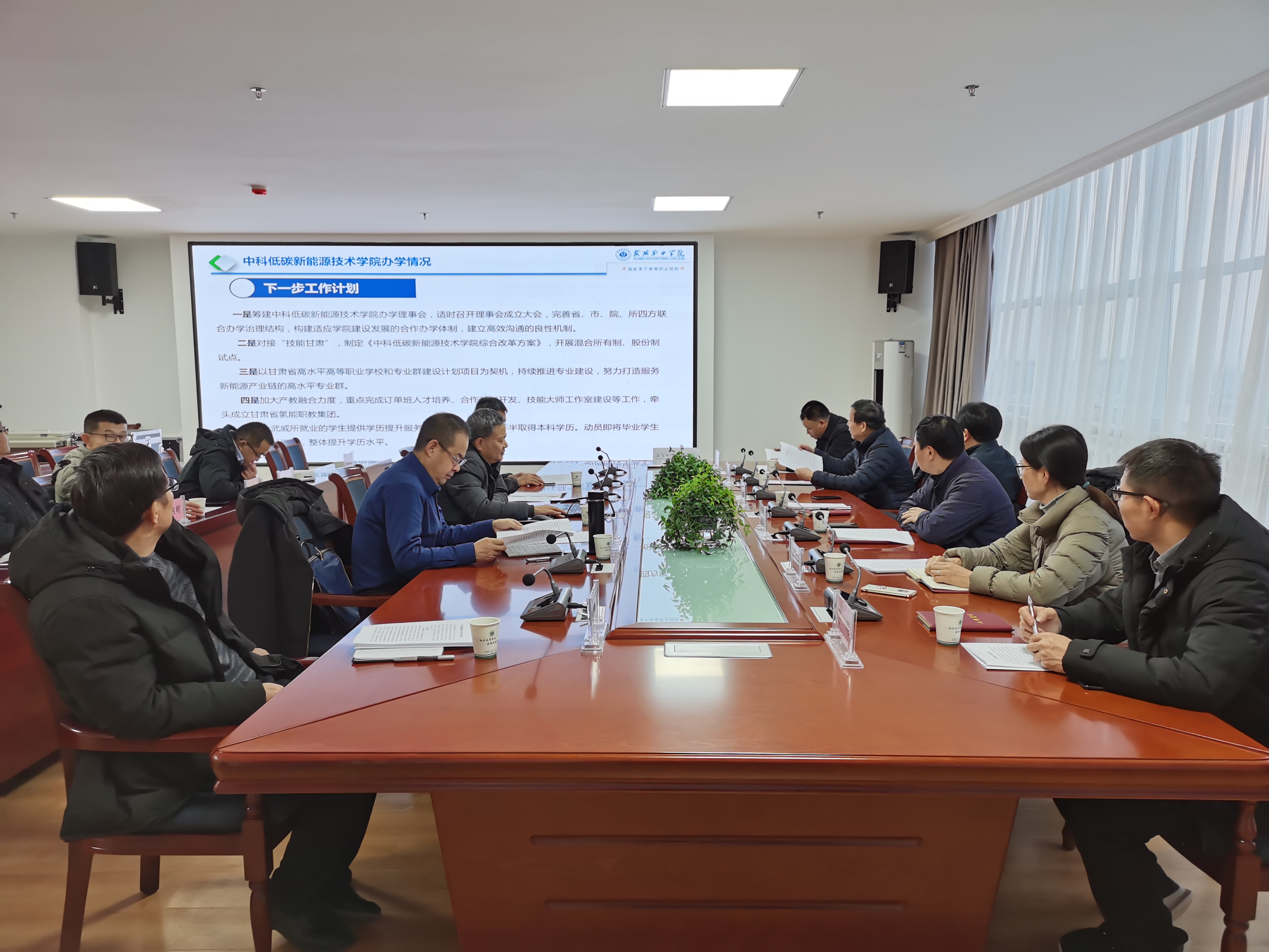 戴志敏指出通過參觀考察全面深入了解到武威職業(yè)學院雄厚的辦學實力和較高辦學水平,對聯(lián)合辦學以來中科低碳新能源技術學院取得的成就表示充分肯定和認可,非常贊同學院提出的中科低碳新能源技術學院下一步發(fā)展規(guī)劃,表示所里將在合作辦學理事會籌建、實驗實訓基地建設、校內實驗室建設、教材開發(fā)編寫、新能源科技館建設、科研項目申報研究、師資培訓、學生頂崗實習和就業(yè)、“雙高”院校創(chuàng)建等方面給予全力支持,促進中科低碳新能源技術學院合作辦學更深、更實、更好發(fā)展。