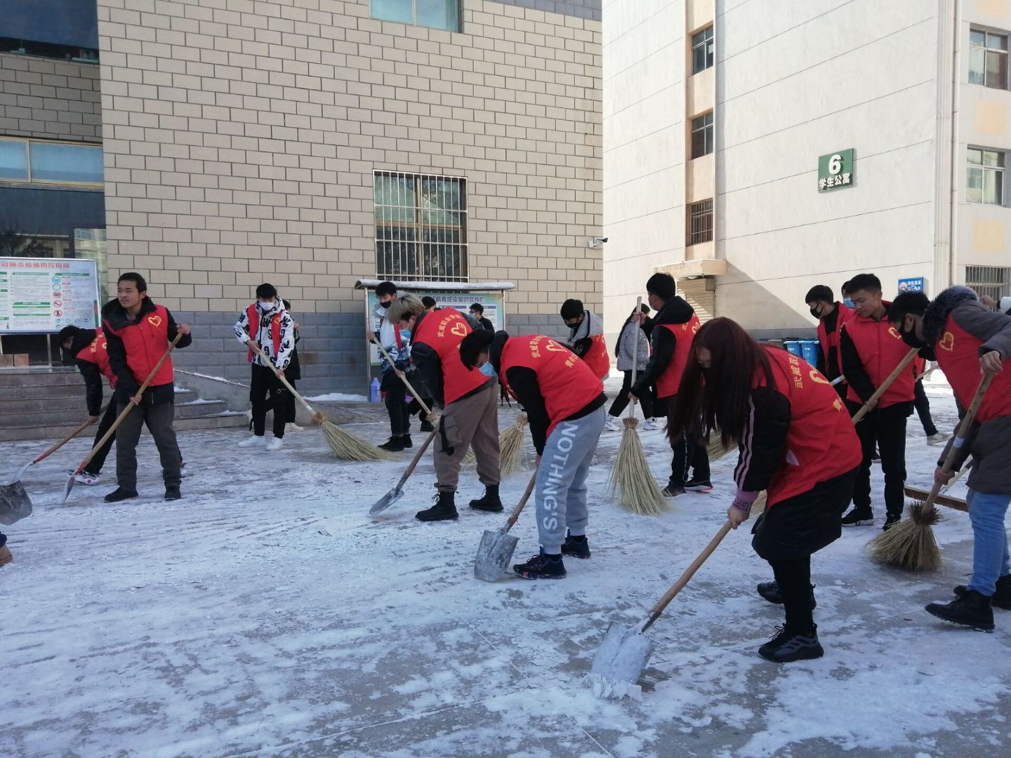 本次鏟雪的區(qū)域是教學(xué)樓區(qū)域的主干道和食堂門前道路。寒冷的天氣擋不住大家的勞動(dòng)熱情,厚厚的冰塊蓋不住大家的志愿精神。鐵鍬聲此起彼伏,大家分工明確,相互合作,現(xiàn)場(chǎng)氣氛熱烈。經(jīng)過(guò)多小時(shí)的勞動(dòng),大家將教學(xué)樓前主干道積雪基本清掃干凈。