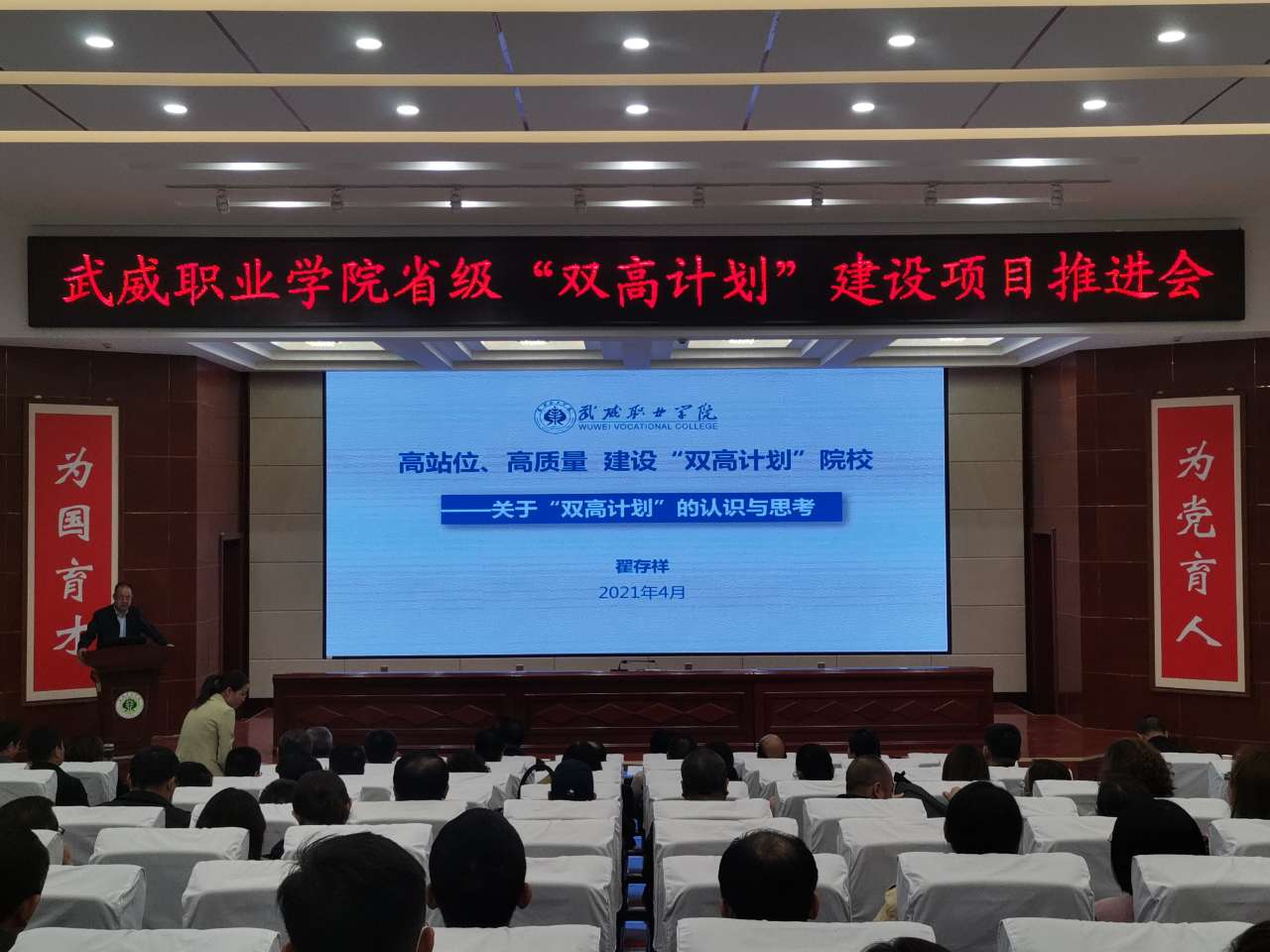 為推進學院“雙高計劃”建設工作,4月21日下午,在大學生活動中心菁英廳召開了“雙高計劃”建設項目推進會。學院領導班子出席了會議,副科級以上干部、項目組和專項工作組負責人、專業(yè)群負責人、項目組成員等共計220余人參加了會議。會議由黨委副書記翟存祥主持。