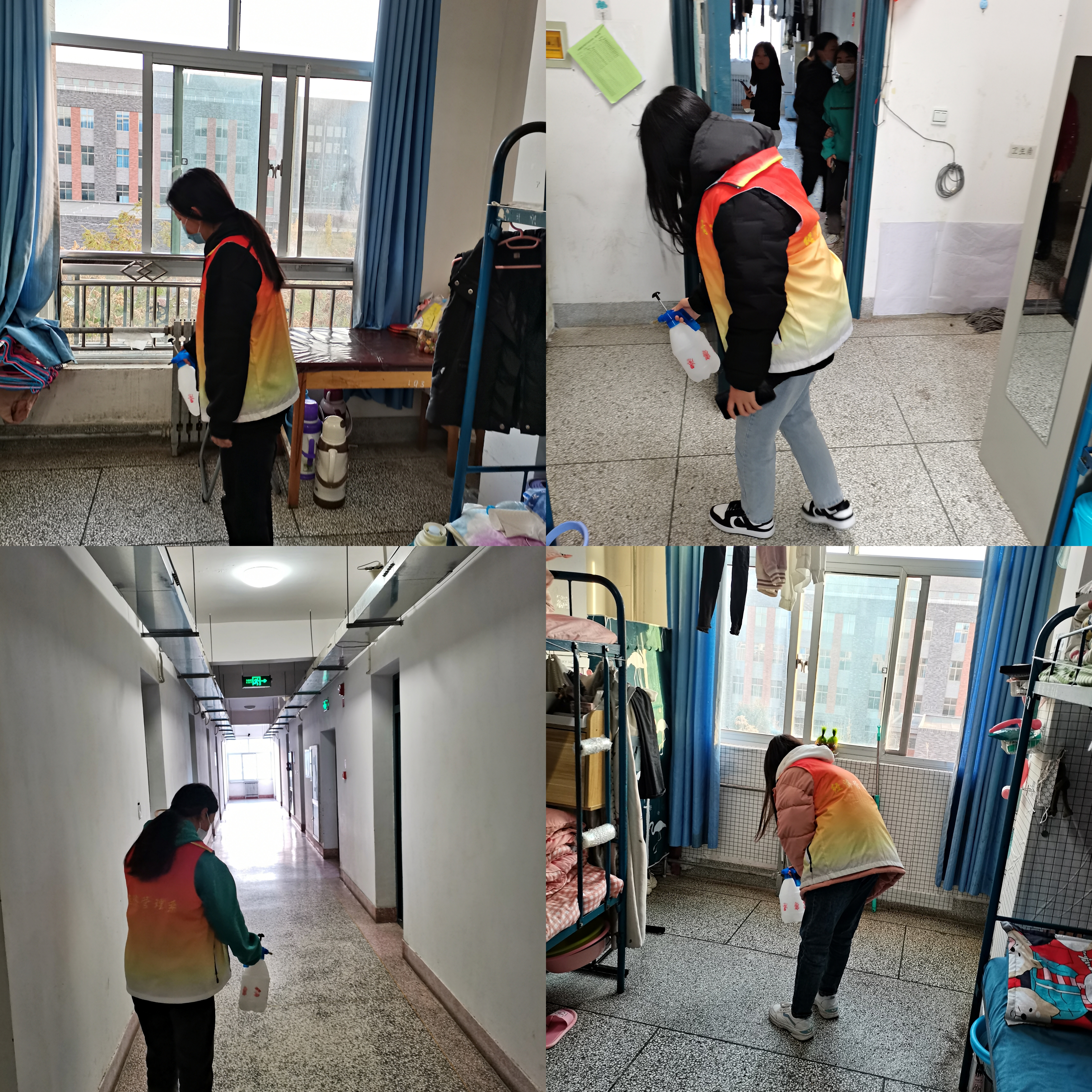 為切實(shí)抓好宿舍及公共區(qū)域防控消殺工作,營造安全舒適的學(xué)習(xí)生活環(huán)境,志愿者協(xié)會(huì)根據(jù)不同職能劃分為7個(gè)小組,按照“一天兩次”消殺頻率持續(xù)對(duì)經(jīng)緯樓、3號(hào)學(xué)生公寓等宿舍樓內(nèi)的學(xué)生宿舍進(jìn)行通風(fēng)消毒工作,重點(diǎn)對(duì)宿舍地面、床底、門角處等位置進(jìn)行全方位、多角度消毒,盡量做到消殺不留死角。同時(shí),志愿者還通過網(wǎng)絡(luò)平臺(tái)學(xué)習(xí)疫情防控措施相關(guān)知識(shí),并在消殺過程中為同學(xué)們普及疫情防控知識(shí),全面加強(qiáng)宣傳引導(dǎo),幫助廣大師生在第一時(shí)間了解防疫資訊,有效杜絕謠言傳播,確保廣大師生情緒穩(wěn)定。