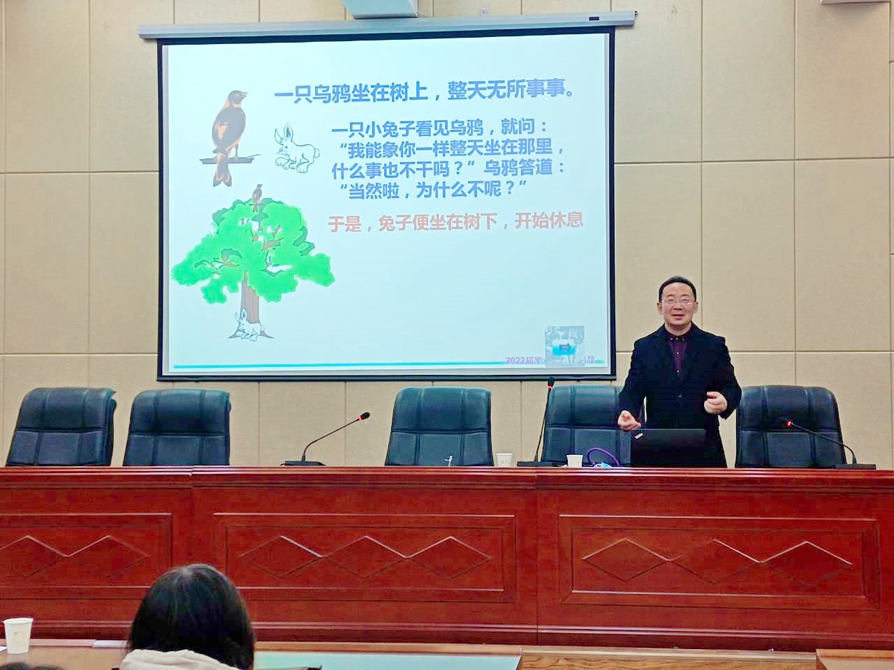 最后,金主任對同學(xué)們開展就業(yè)指導(dǎo)。期間,金主任以幽默風(fēng)趣的語言,結(jié)合自身經(jīng)歷,貼合實際講解,引導(dǎo)同學(xué)們樹立正確的就業(yè)觀和擇業(yè)觀,以積極的心態(tài)面對嚴(yán)峻的就業(yè)形勢。