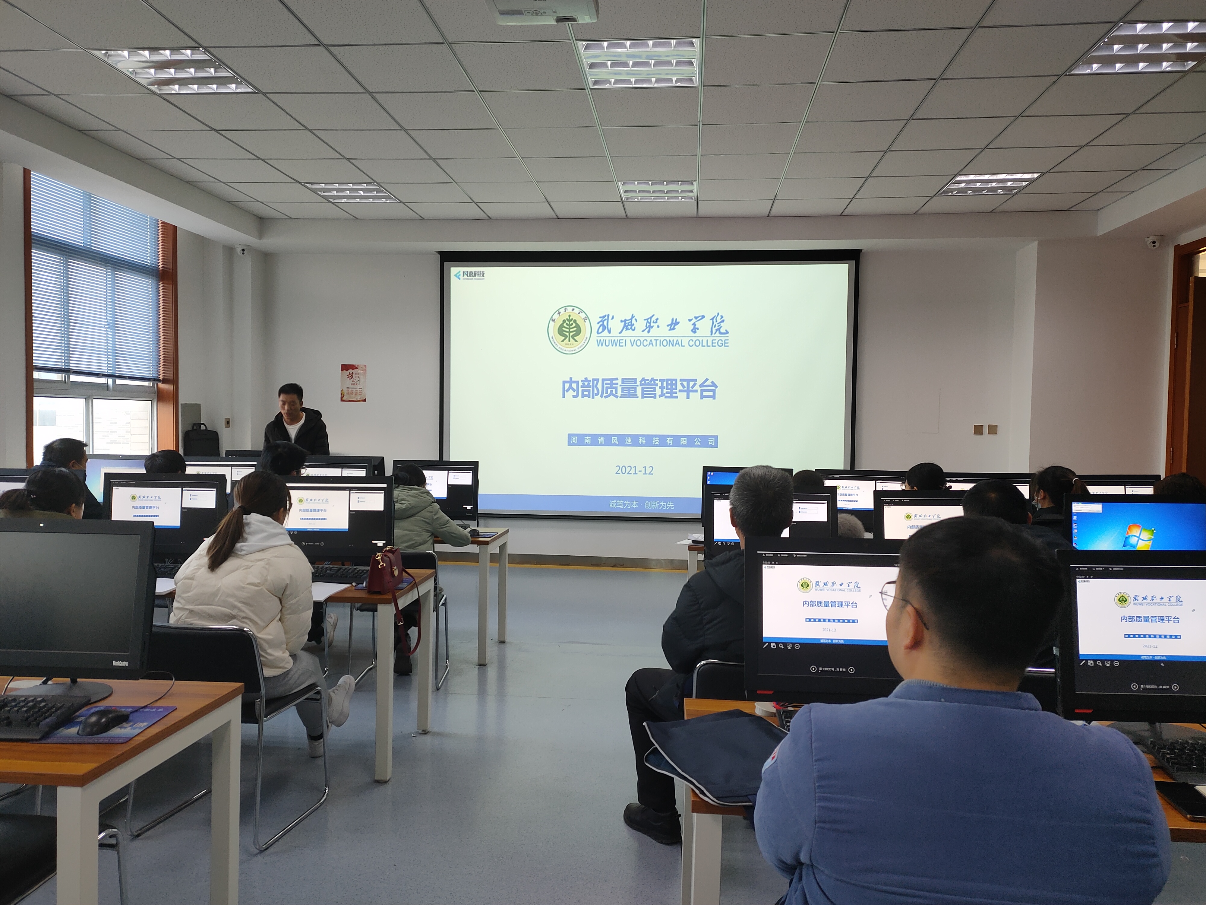 風(fēng)速科技有限公司項(xiàng)目經(jīng)理徐來彬?qū)?huì)教師進(jìn)行了培訓(xùn)。重點(diǎn)介紹了內(nèi)部質(zhì)量管理平臺(tái)整體架構(gòu)、主要功能、任務(wù)提取、上傳、轉(zhuǎn)辦,任務(wù)辦理與審核、通報(bào)、文檔庫上傳與使用、績效考核等,并進(jìn)行現(xiàn)場操作演示,就參會(huì)教師存在的問題進(jìn)行了溝通交流。