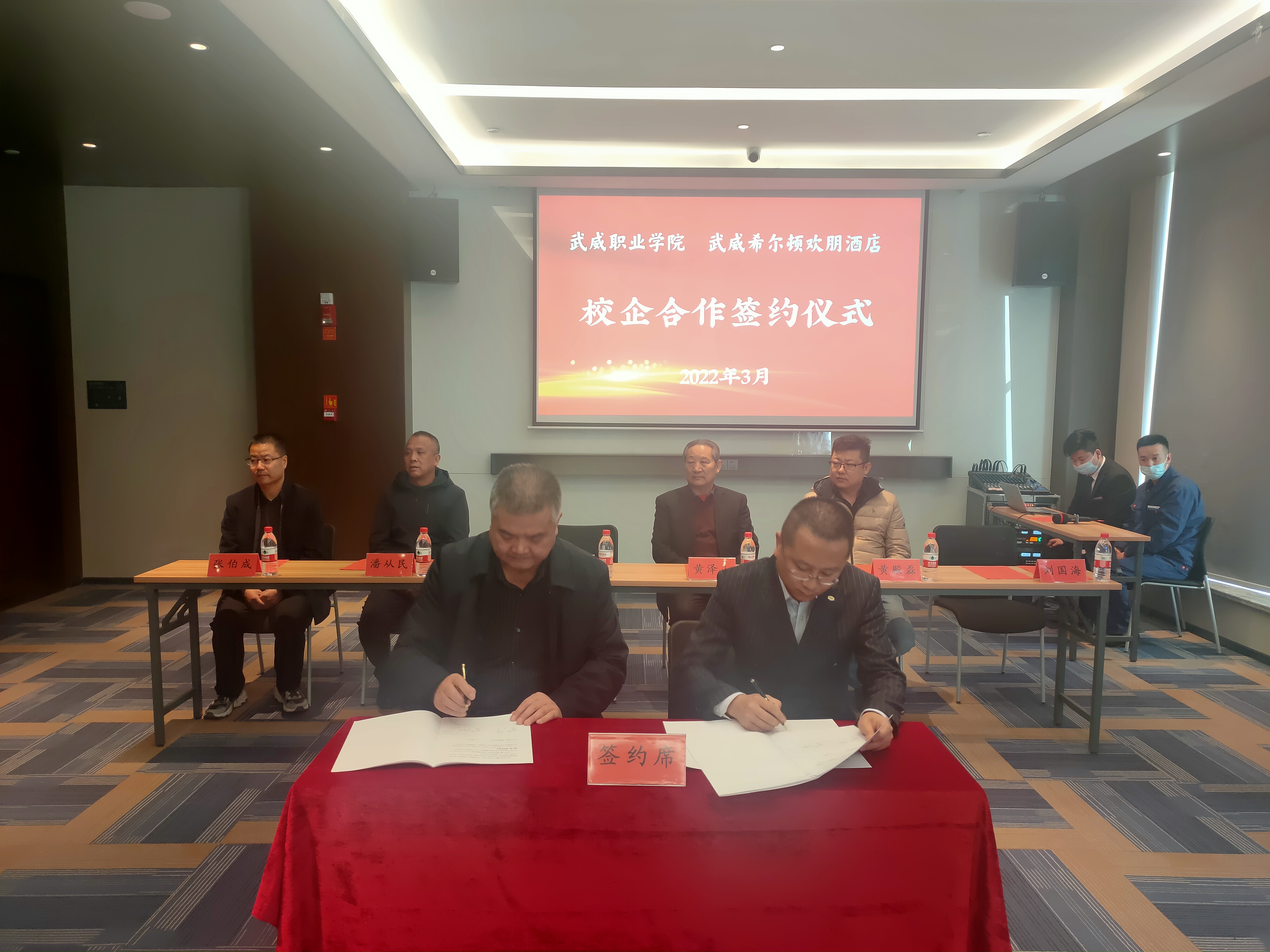 為深入貫徹落實(shí)教育部2022屆普通高校畢業(yè)生就業(yè)創(chuàng)業(yè)網(wǎng)絡(luò)視頻會(huì)議精神,統(tǒng)一思想,提高認(rèn)識(shí),服務(wù)學(xué)院“雙高計(jì)劃”建設(shè),3月2日,學(xué)院與武威希爾頓歡朋酒店舉行校企合作揭牌暨簽約儀式,副校長(zhǎng)王守云代表學(xué)院出席簽約儀式。