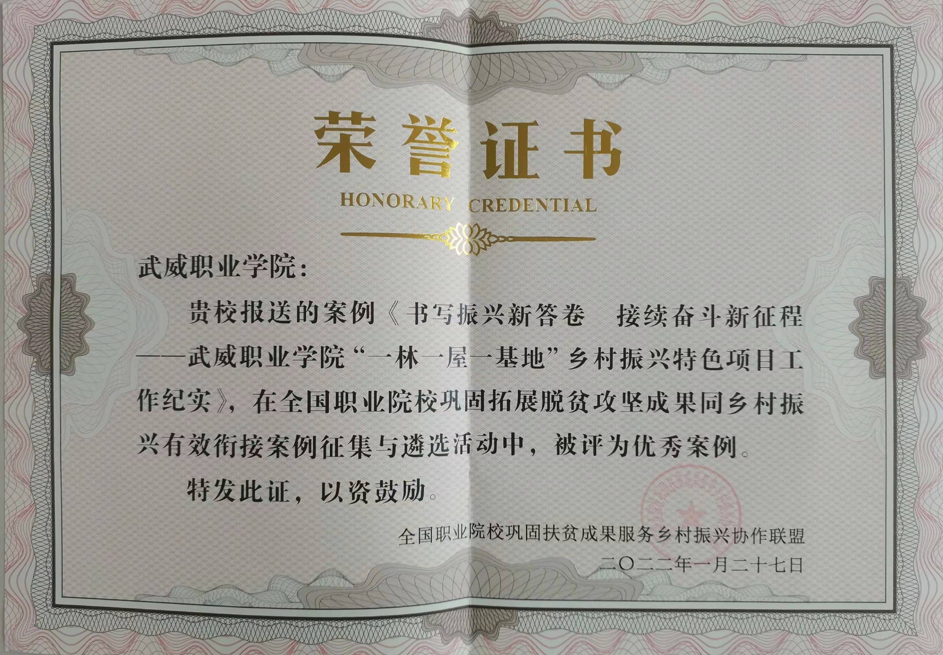 近日,學(xué)院鄉(xiāng)村振興成果《書寫振興新答卷 接續(xù)奮斗新征程——武威職業(yè)學(xué)院“一林一屋一基地”鄉(xiāng)村振興特色項(xiàng)目工作紀(jì)實(shí)》被全國職業(yè)院校鞏固扶貧成果服務(wù)鄉(xiāng)村振興協(xié)作聯(lián)盟評為優(yōu)秀案例。