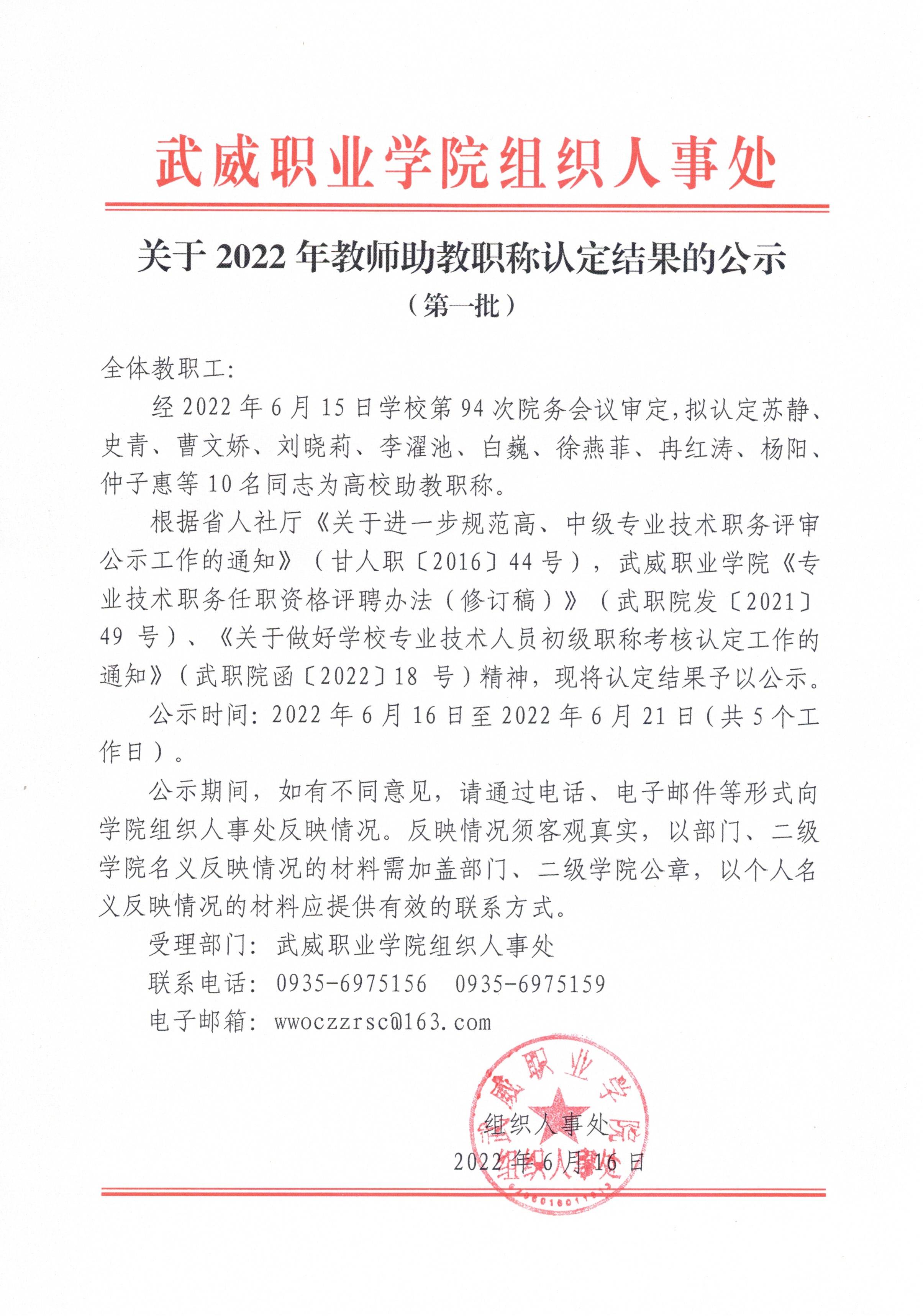 關(guān)于2022年教師助教職稱認(rèn)定結(jié)果的公示(第一批)