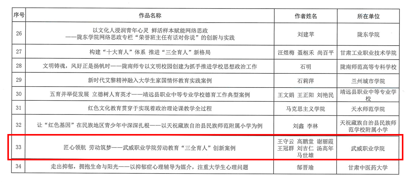 近日,2022年全省學(xué)校思想政治教育工作成果征集活動(dòng)評(píng)選結(jié)果公布,武威職業(yè)學(xué)院喜獲佳績(jī),兩件作品獲獎(jiǎng)。其中,王守云、高鵬堂、謝麗霞、王冠群、劉吉仁、湯高年、馬世雄老師的《匠心領(lǐng)航 勞動(dòng)筑夢(mèng)—武威職業(yè)學(xué)院勞動(dòng)教育“三全育人”創(chuàng)新案例》獲思想政治典型案例三等獎(jiǎng);張保海、馮文娟、謝麗霞老師的《基于“診改”的思政教育質(zhì)量評(píng)價(jià)體系構(gòu)建研究》獲思想政治論文三等獎(jiǎng)。
