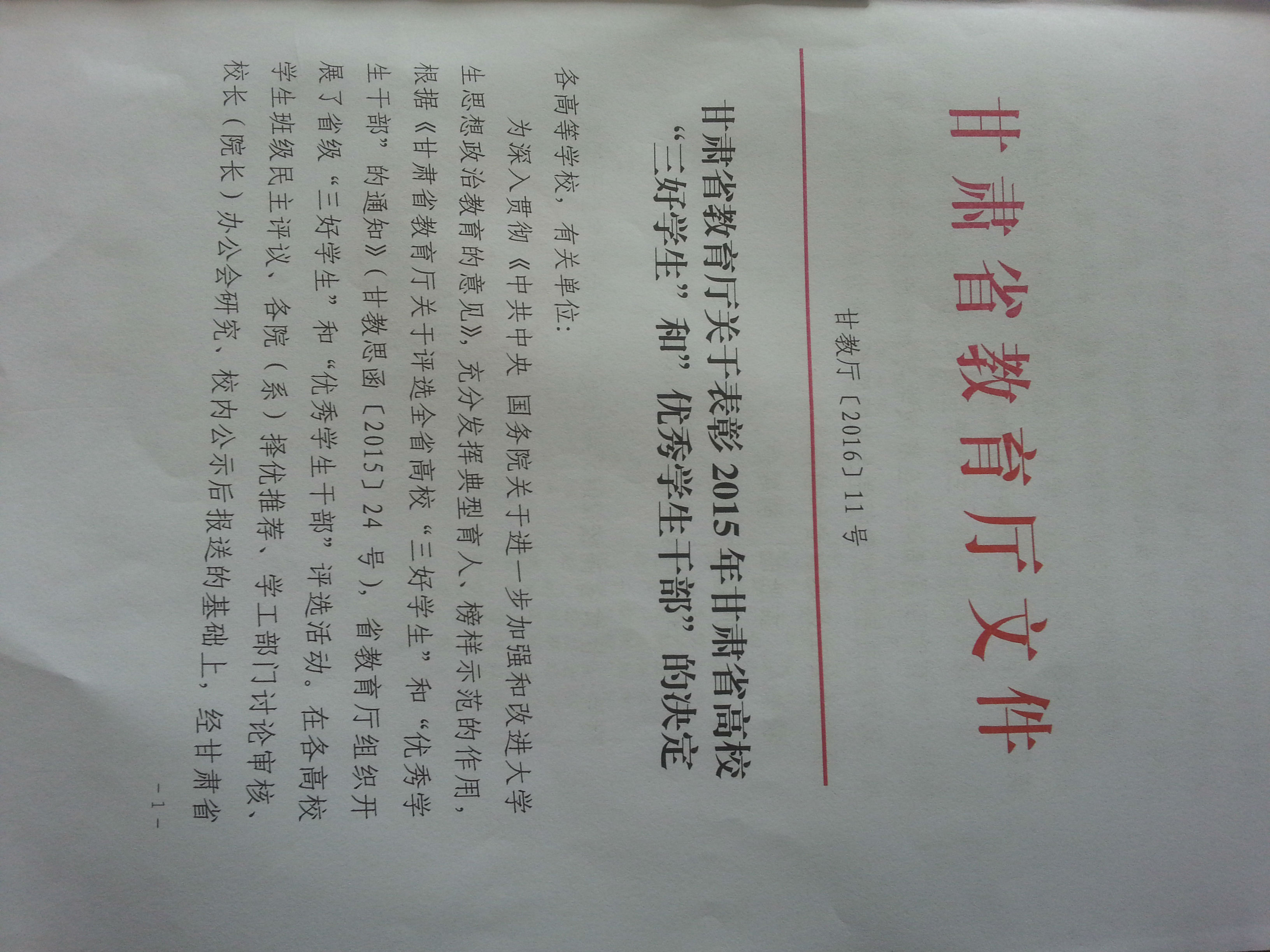甘肅省教育廳關于表彰2015年甘肅省高?!叭脤W生”和“優(yōu)秀學生干部”的決定