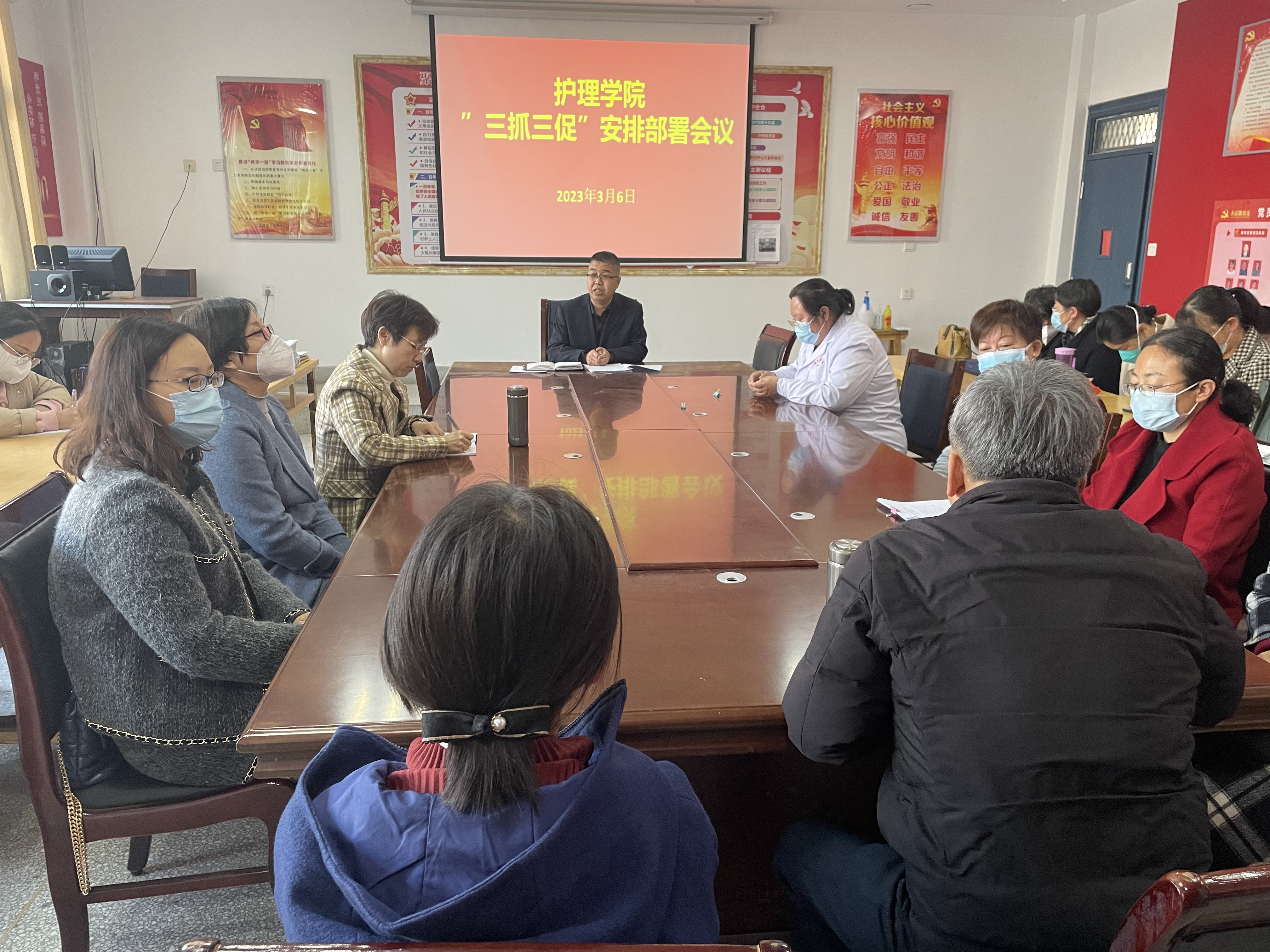 會議傳達學習了《武威職業(yè)學院“三抓三促”行動實施方案》《護理學院“三抓三促”行動實施方案》及學?!叭ト佟毙袆觿訂T部署會議精神,并結合護理學院工作實際,對2023年師生技能競賽、貼息貸款項目、護理特色骨干專業(yè)群建設、護理學院內涵發(fā)展和申辦本科層次職業(yè)學校等重點工作進行了安排部署。