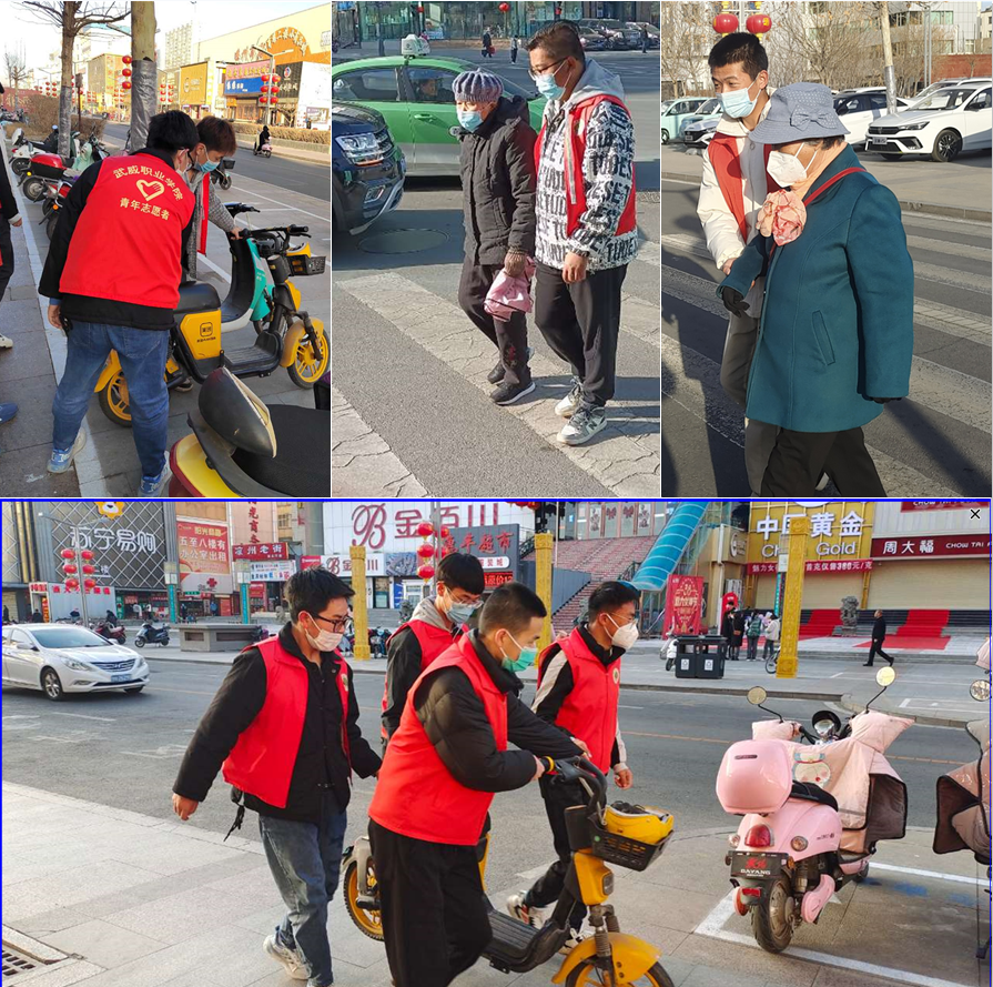 第二組志愿者在文化廣場十字路口配合交警進行文明交通志愿服務(wù),引導(dǎo)大家維護交通秩序,文明出行。幫助行動不便的老人過馬路,整理擺放路邊共享單車,電動車。