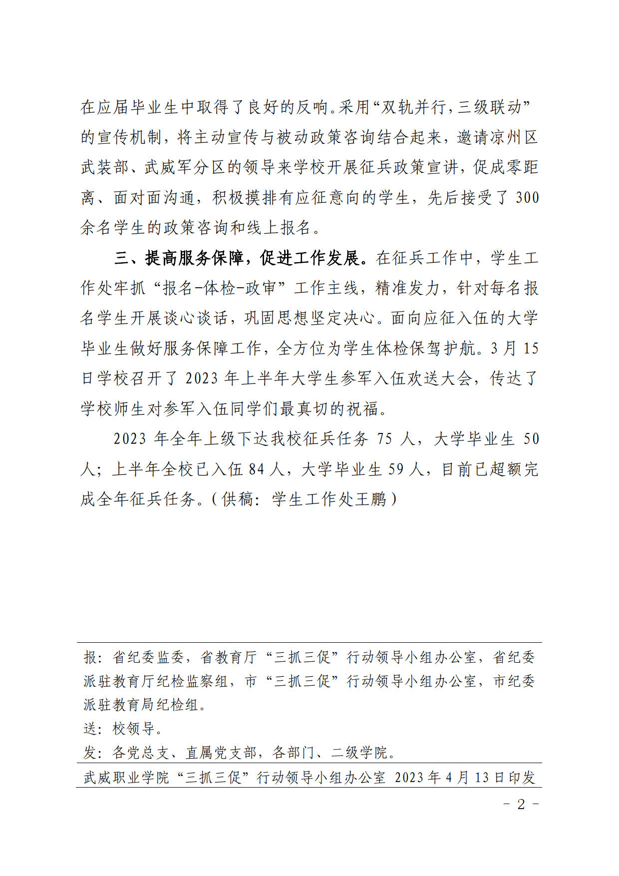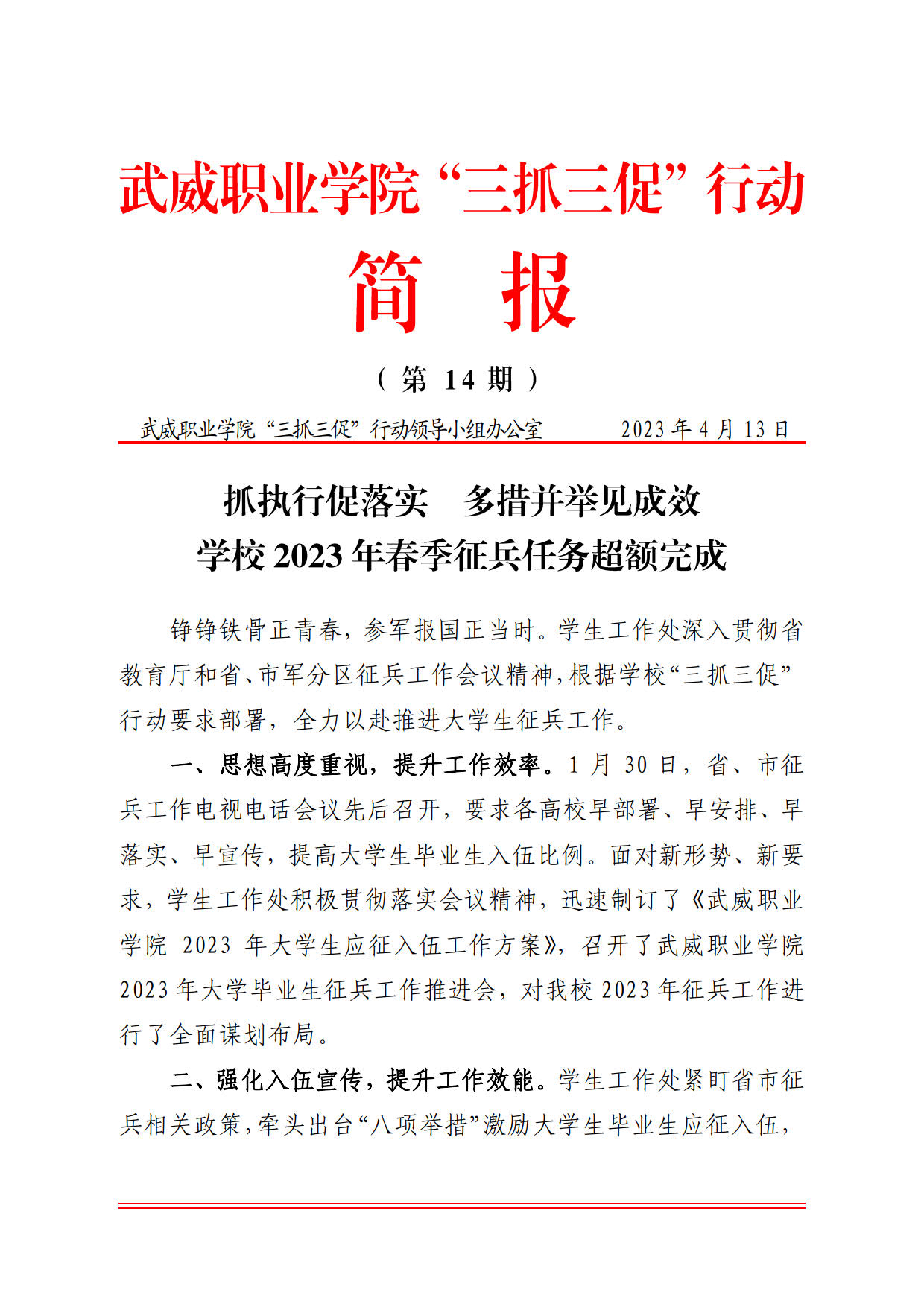 簡報第14期:抓執(zhí)行促落實 多措并舉見成效 學校2023年春季征兵任務(wù)超額完成