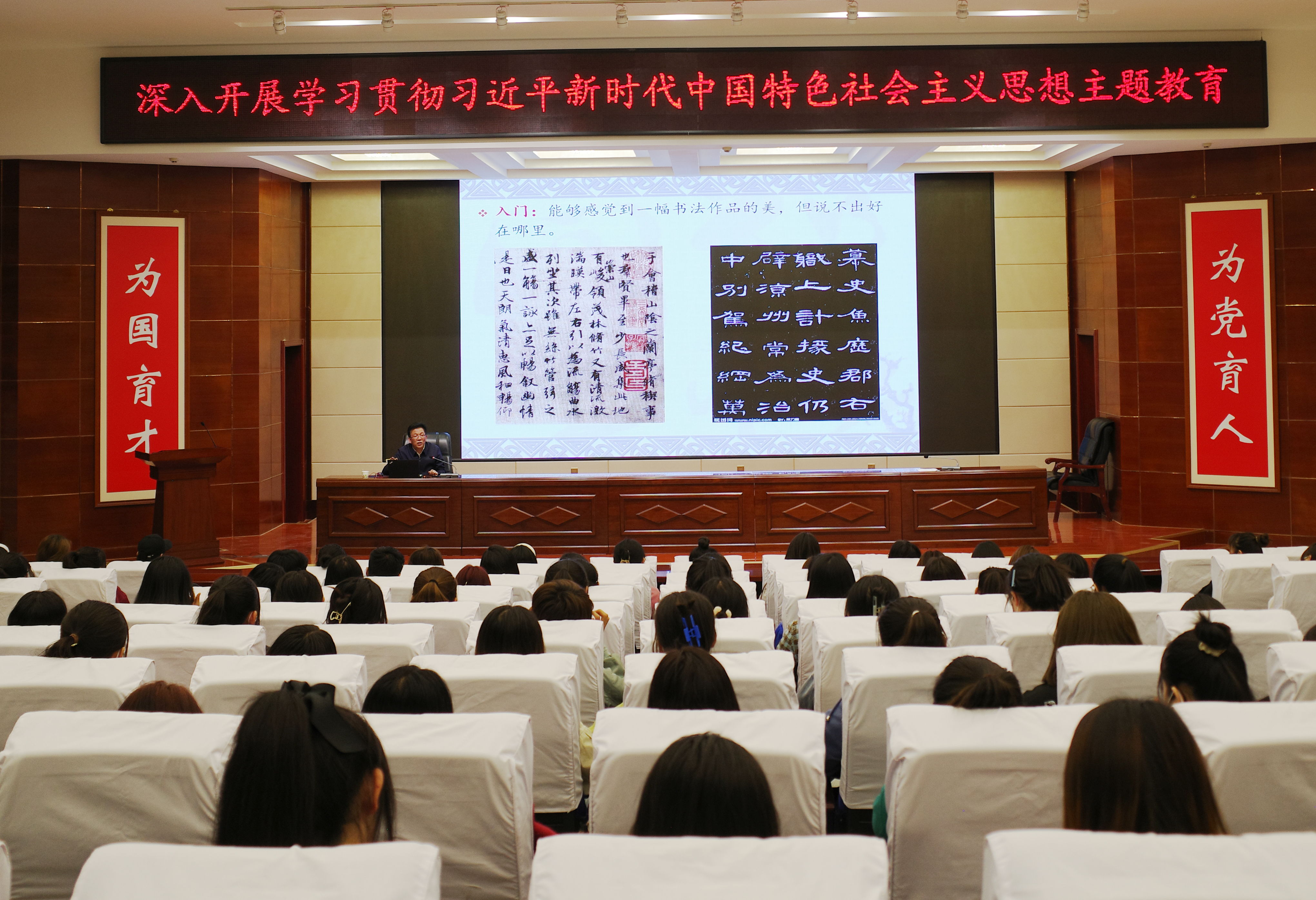 活動中,齊澤山在菁英廳為師生做了題為“如何欣賞書法作品”專題講座,他介紹了中國書法藝術(shù)的起源、傳統(tǒng)、特點,以《蘭亭序》《曹全碑》等多幅經(jīng)典書法作品為例,深入解析了書法藝術(shù)的魅力與內(nèi)涵,清晰呈現(xiàn)了中國書法悠久的歷史脈絡(luò),使師生們對中國書法藝術(shù)的起源與發(fā)展有了更加深刻地理解。講座引經(jīng)據(jù)典、風趣幽默、親切自然,讓師生在輕松愉悅的氛圍中升華了對書法藝術(shù)的審美感受。師生們紛紛表示,此次講座是一次難得的學習機會,受益匪淺,對中國書法藝術(shù)有了更深入、更全面的了解。