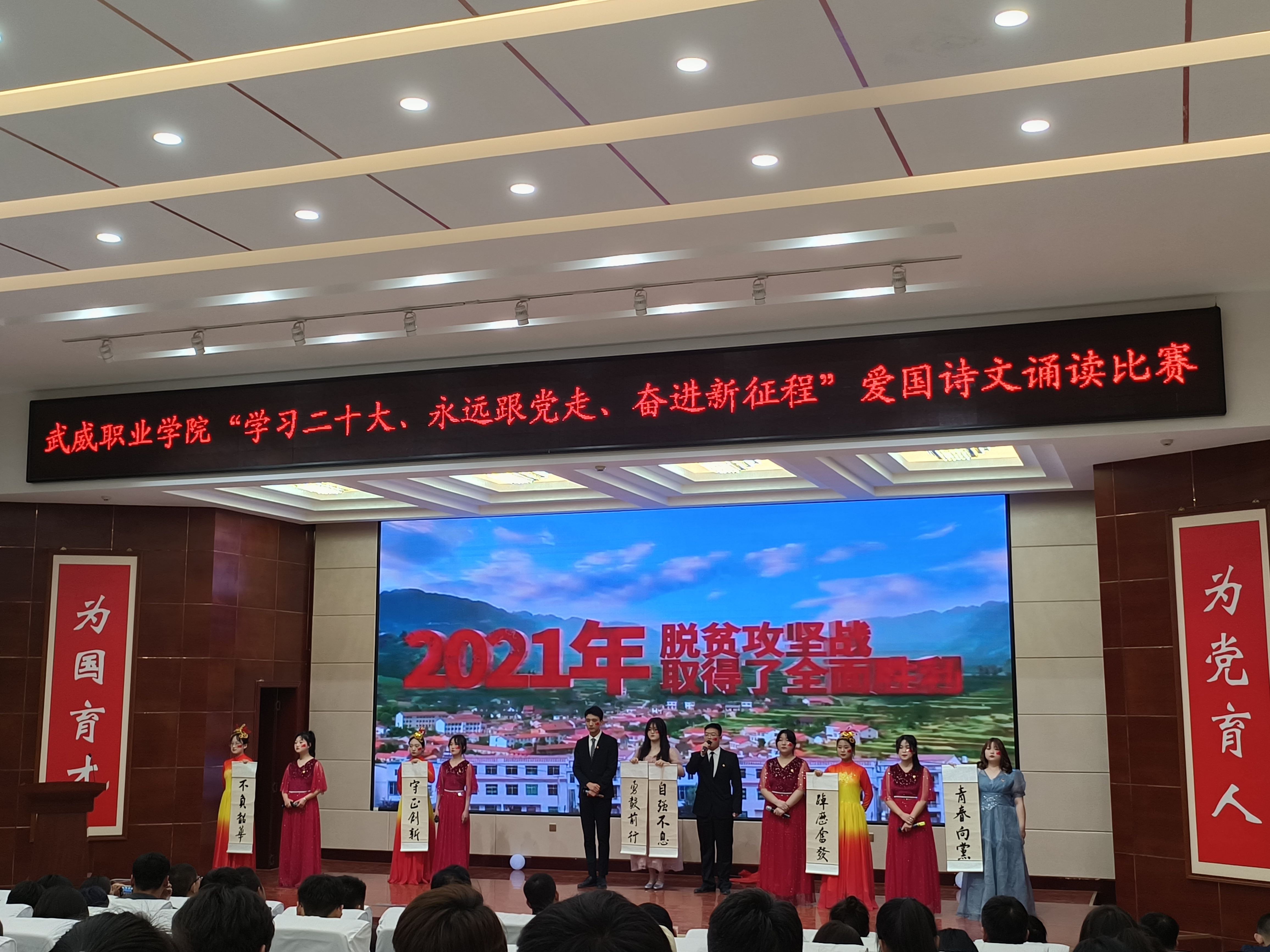 2023年4月20日,藥學(xué)院參加武威職業(yè)學(xué)院以“學(xué)習(xí)二十大 永遠(yuǎn)跟黨走 奮進(jìn)新征程”愛(ài)國(guó)詩(shī)文誦讀比賽由校團(tuán)委牽頭在箐英廳舉行愛(ài)國(guó)詩(shī)文誦讀比賽決賽。邀請(qǐng)到了五位評(píng)委老師,現(xiàn)場(chǎng)氛圍如火如荼,所有在場(chǎng)的老師同學(xué)都懷有期待迎來(lái)了比賽的開(kāi)始。