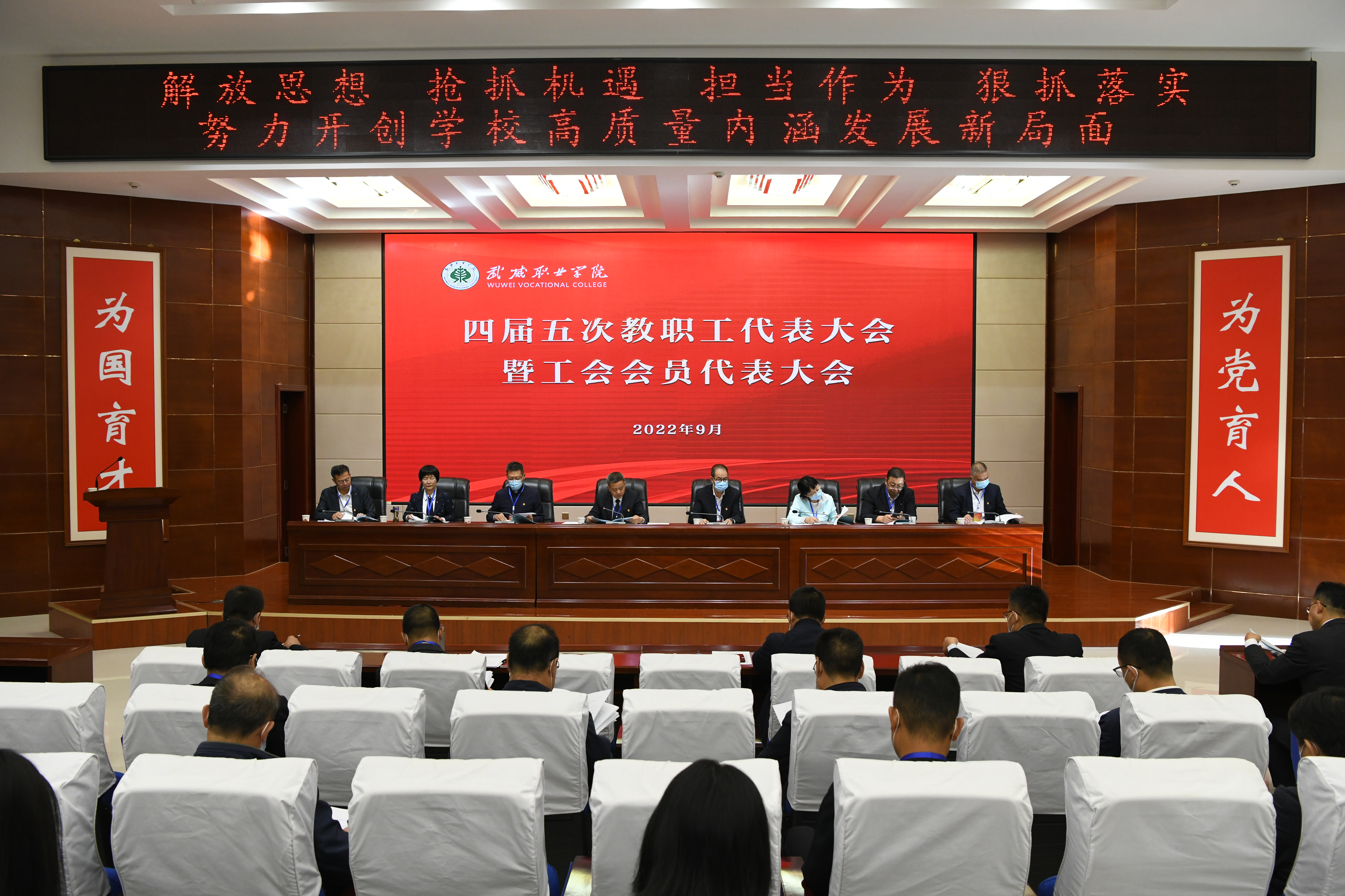 大會(huì)在雄壯的國(guó)歌聲中開幕,黨委書記、校長(zhǎng)趙明作了題為《解放思想 搶抓機(jī)遇 擔(dān)當(dāng)作為 狠抓落實(shí) 努力開創(chuàng)學(xué)校高質(zhì)量發(fā)展新局面》的工作報(bào)告,系統(tǒng)回顧了四屆四次教職工(會(huì)員)代表大會(huì)以來(lái)學(xué)校事業(yè)發(fā)展所取得的顯著成績(jī),分析了學(xué)校當(dāng)前面臨的形勢(shì)與存在的問(wèn)題,明確了今后工作思路和主要工作舉措。副校長(zhǎng)張開禮作了關(guān)于修訂《武威職業(yè)學(xué)院章程》的情況說(shuō)明。大會(huì)以書面形式審議了《學(xué)校財(cái)務(wù)工作報(bào)告》《工會(huì)工作報(bào)告》《工會(huì)經(jīng)費(fèi)審查報(bào)告》。